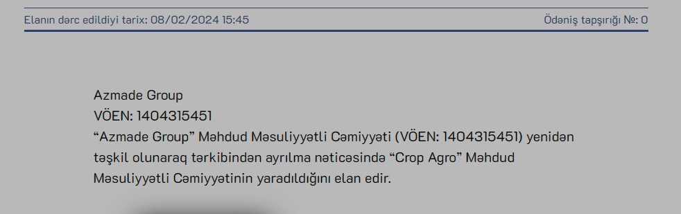 ""Azmade Group” Məhdud Məsuliyyətli Cəmiyyəti yenidən təşkil olunaraq tərkibindən ayrılma nəticəsində “Crop Agro” Məhdud Məsuliyyətli Cəmiyyətinin yaradıldığını elan edir",- Şirkətin bildirişində deyilir.