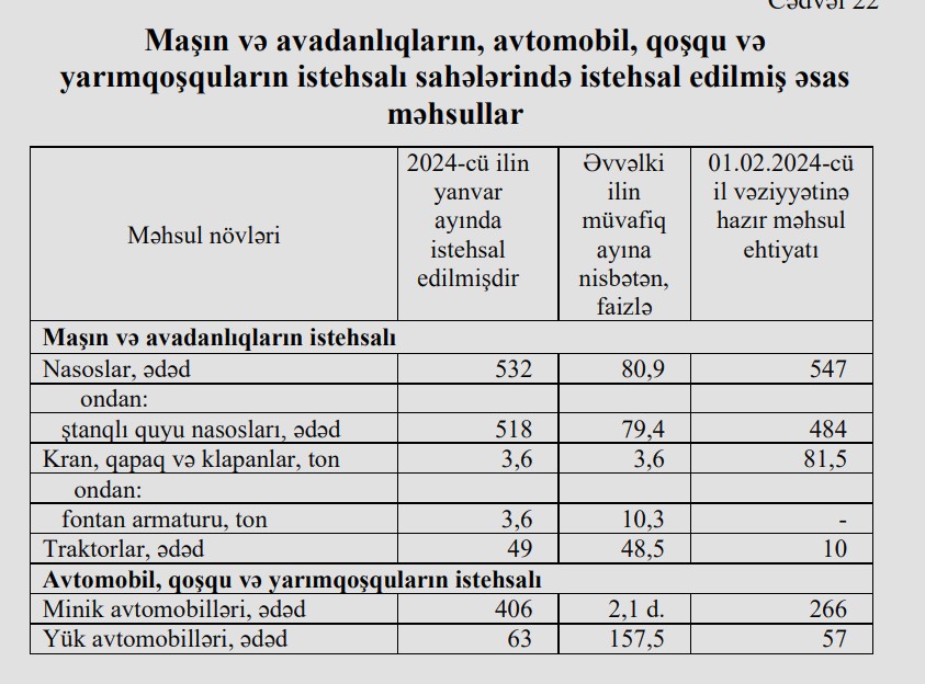 2024-cü ilin yanvar ayında 63 ədəd yük avtomobili (+57,5%), 49 ədəd traktor (-51,5%) istehsal edilib. 01.02.2024-cü il vəziyyətinə hazır məhsul ehtiyatı müvafiq olaraq 57 ədəd və ya 10 ədəd təşkil edib.