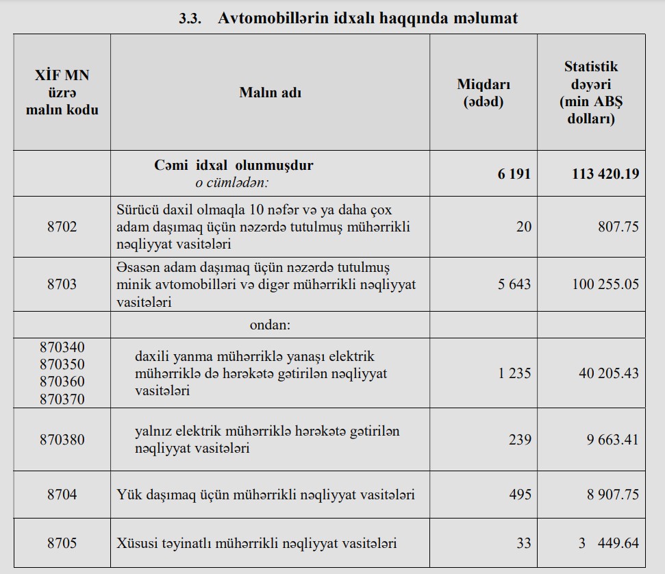 2024-cü ilin Yanvar ayında Azərbaycana 113 milyon 420 min dollar dəyərində 6 min 191 ədəd avtomobil (nəqliyyat vasitələri) idxal olunub. 2023-cü ilin Yanvar ayı ilə müqayisədə avtomobil idxalı məbləğ ifadəsində 10,5% və ya 10 milyon 800 min dollar artıb, miqdar ifadəsində (say) 690 ədəd və ya 10% azalıb.