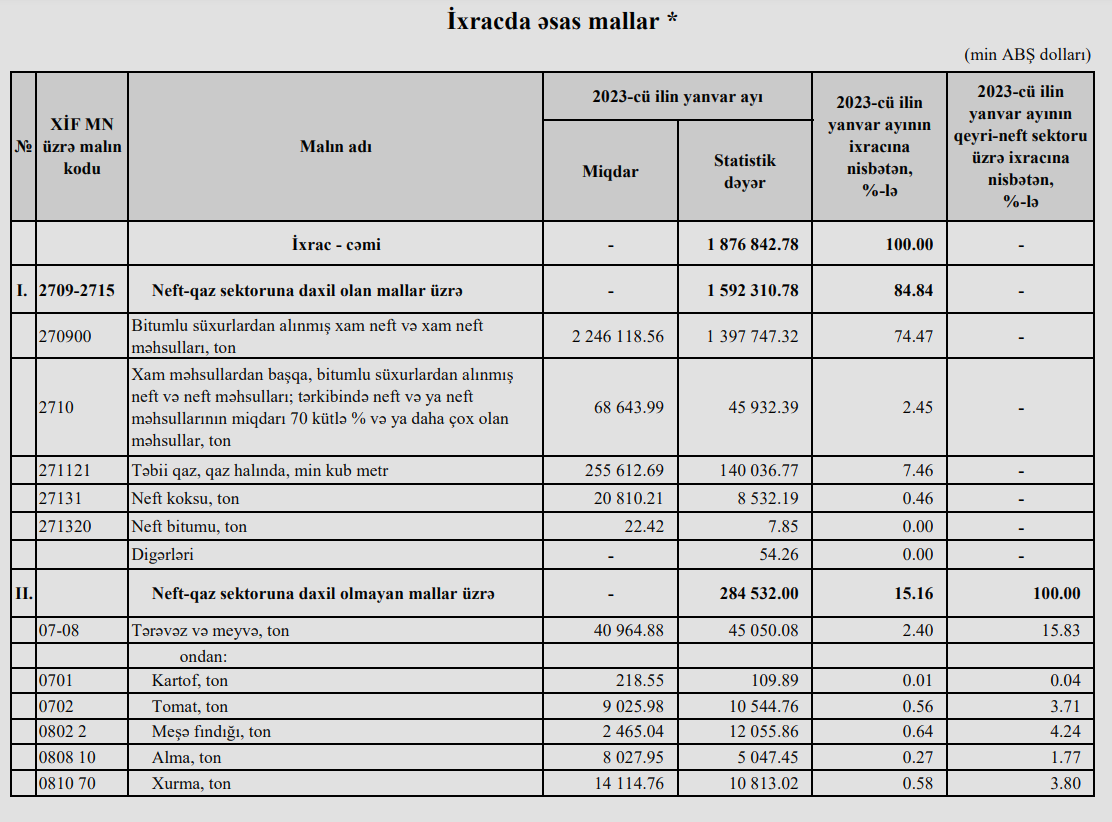2023-cü ilin Yanvar ayında Azərbaycandan 1 milyard 397 milyon 747 min dollar dəyərində xam neft, 140 milyon 36 min dollar dəyərində təbii qaz ixrac edilmişdi.