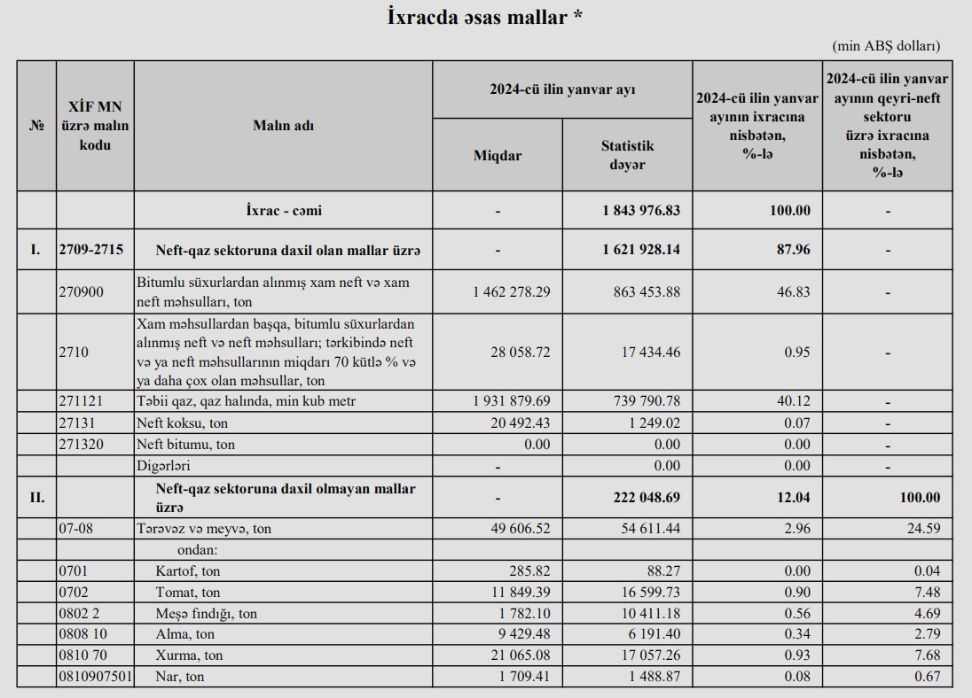 Beləliklə, Azərbaycandan xam neft ixracının dəyəri 2023-cü ilin yanvar ayı ilə müqayosədə 2024-cü ilin yanvar ayında 38,2% və ya 534 milyon 294 min dollar azalıb, təbii qaz ixracının dəyəri isə 5,2 dəfə və ya 599 milyon 754 min dollar artıb.