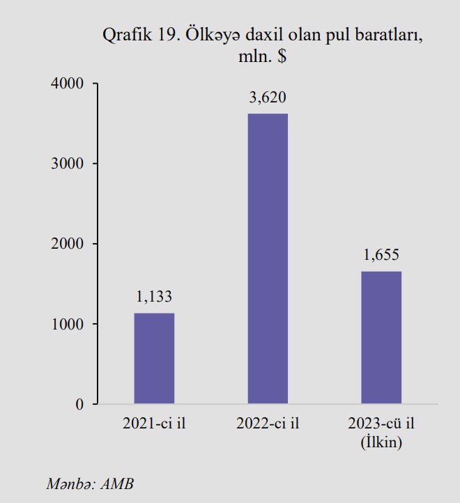 2022-ci ildə ölkəyə daxil olan pul baratlarının həcmi 3 milyard 620 milyon dollar təşkil etmişdi.