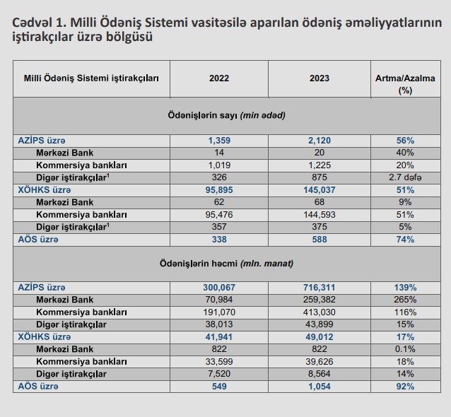 2022-ci il ilə müqayisədə aparılan əməliyyatların həcmində AZİPS üzrə 2.4 dəfə, XÖHKS üzrə isə 16.9%, AÖS üzrə isə 91.8% artım müşahidə olunmuşdur.