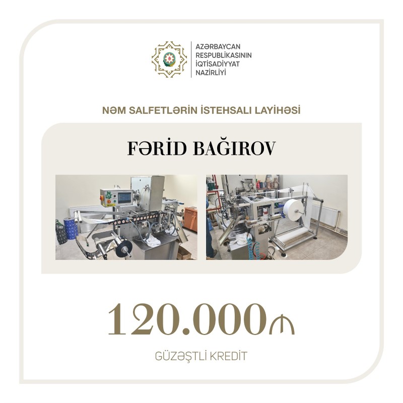 Sahibkar Fərid Bağırov nəm salfetlərin istehsalı layihəsi üzrə Sahibkarlığın İnkişafı Fondundan güzəştli kredit cəlb edib.