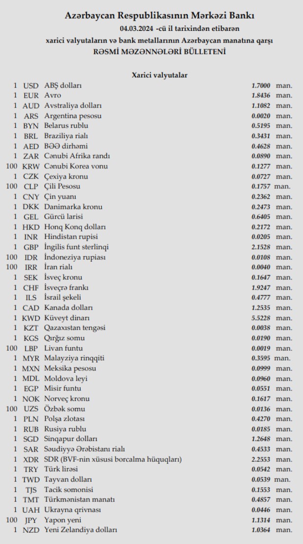 Rəsmi məzənnələr açıqlandı