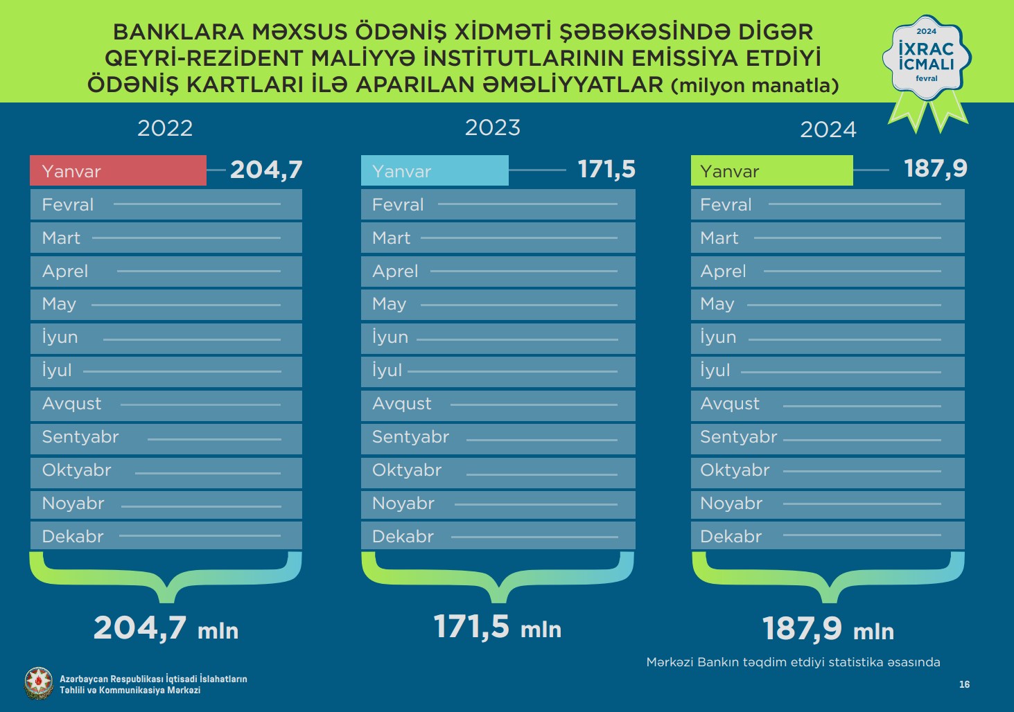 Müqayisə üçün qeyd edək ki, əcnəbilər ödəniş kartları ilə Azərbaycanda 2022-ci ilin Yanvarında 204,7 milyon manatlıq, 2023-cü ilin yanvarında isə 171,5 milyon manatlıq əməliyyatlar aparmışdılar.