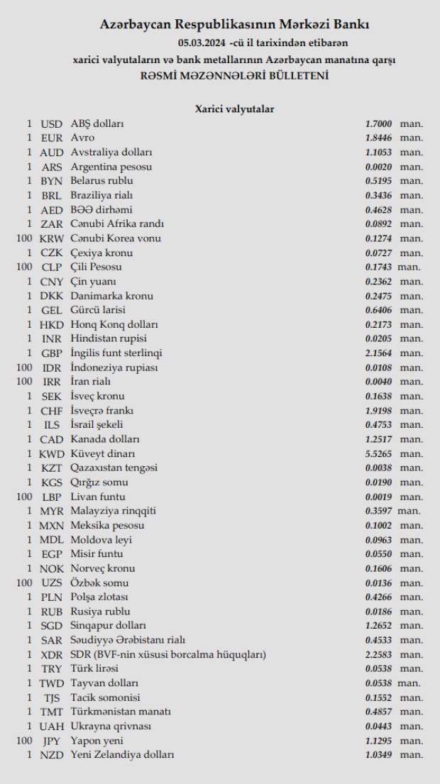 Rəsmi məzənnələr açıqlandı