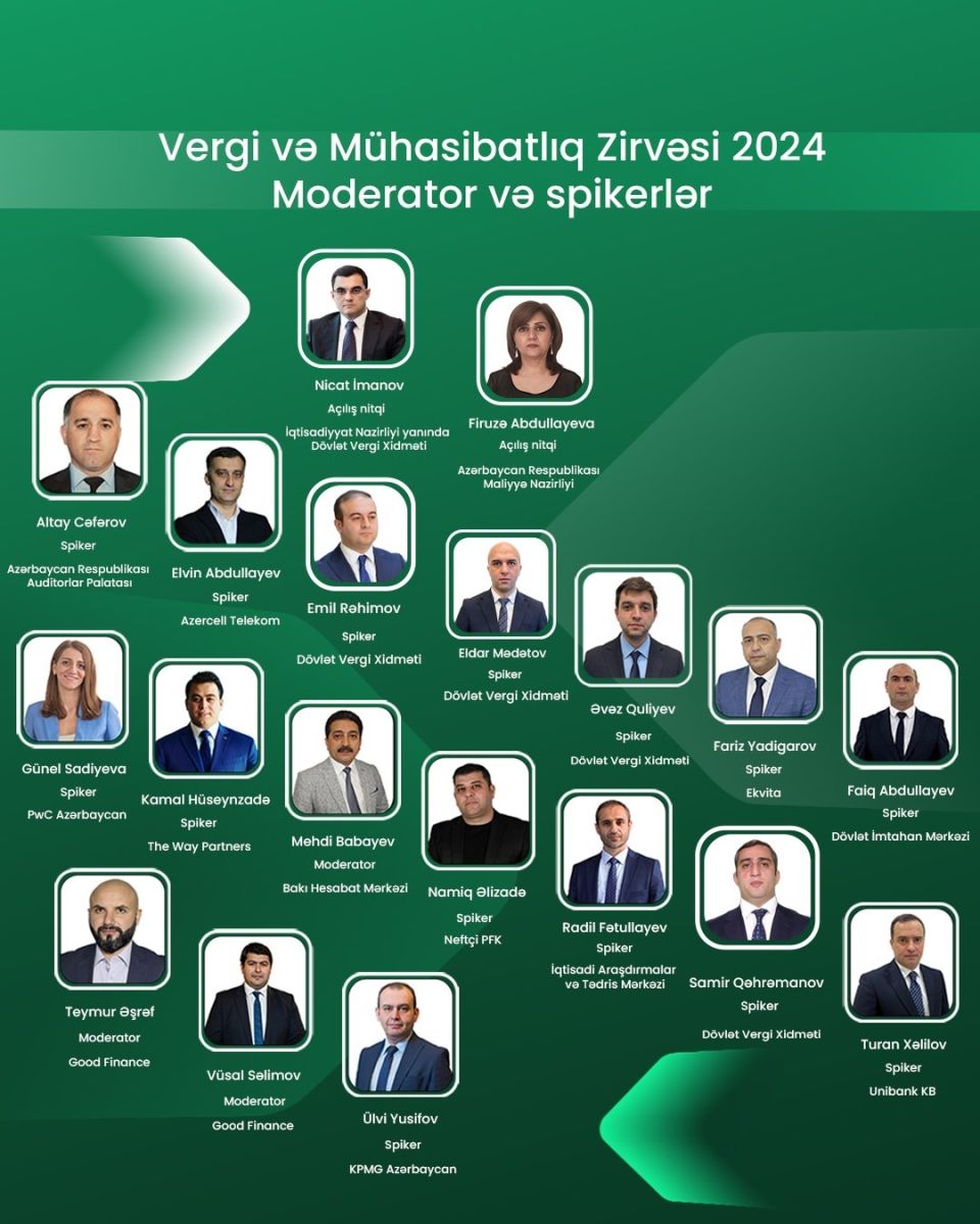 3 moderator və 14 spiker " Düzgün Hesab" şüarı ilə "Maliyyə hesabları və uçot", "Vergi Məcəlləsi - 2024", "Vergi riskləri" panelləri üzrə sahəyə dair müxtəlif mövzuları müzakirə edəcəklər.