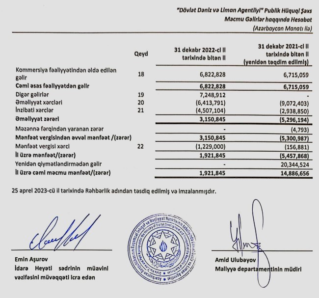 Dövlət Dəniz və Liman Agentliyi 2022-ci ili 1 milyon 922 min manat xalis mənfəət ilə başa vurub. Agentlik 2021-ci ili 5 milyon 458 min manat xalis zərər ilə bağlamışdı.