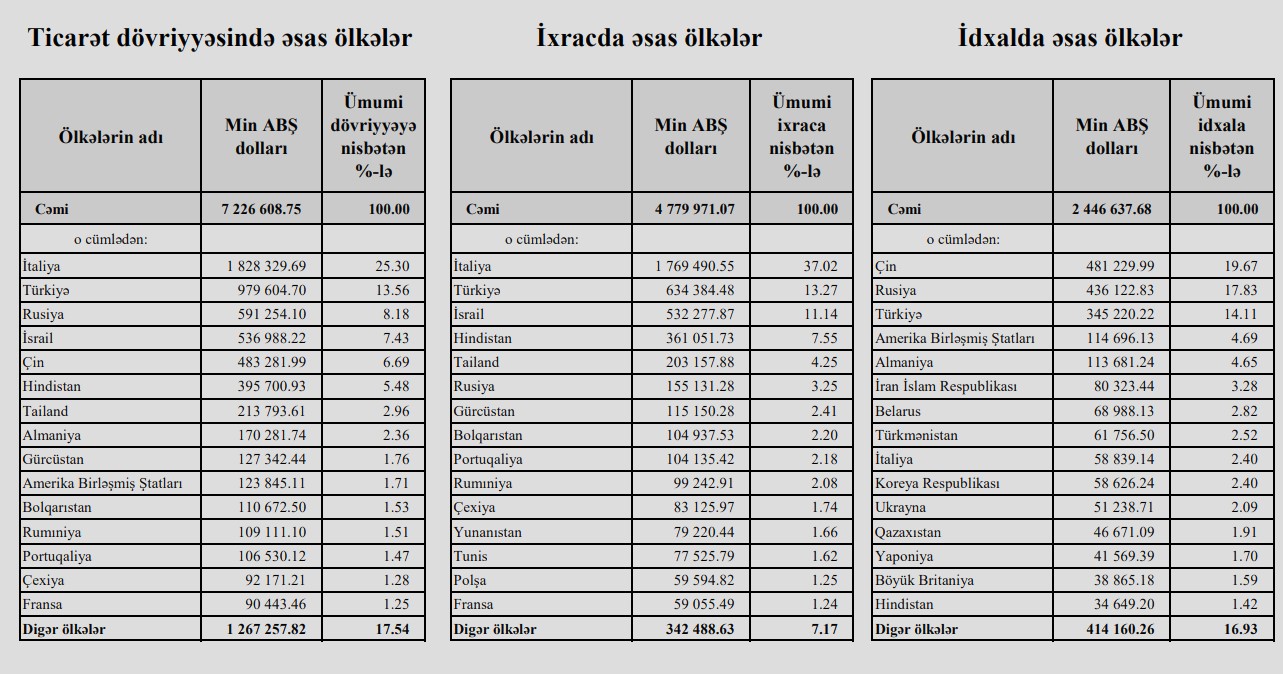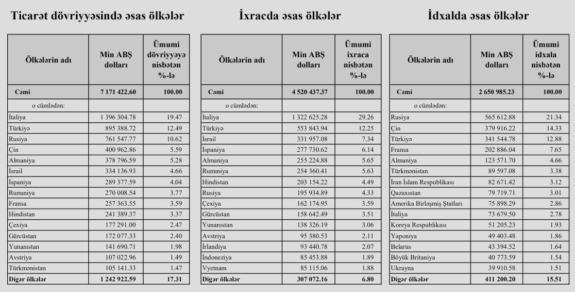 2023-cü ilin ilk 2 ayı ərzində Azərbaycan Rusiyadan 565 milyon 612 min dollarlıq, Çindən 379 milyon 916 min dollarlıq, Türkiyədən isə 341 milyon 544 min dollarlıq mallar almışdı.