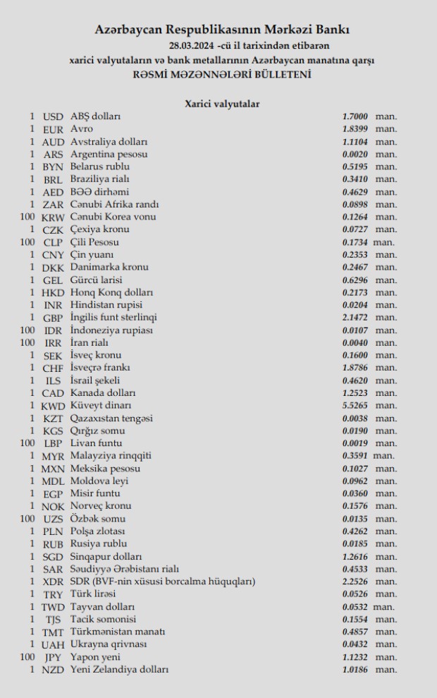 Rəsmi məzənnələr açıqlandı