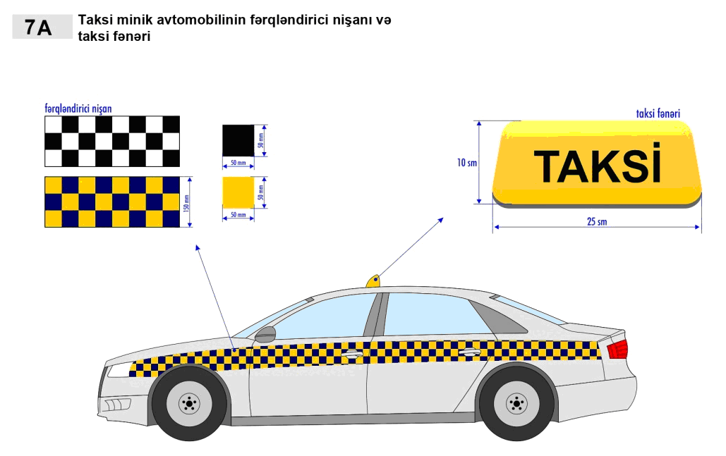 Taksi minik avtomobilinin damında öndən və arxadan görünməklə “Taksi” sözü yazılmış, damın həndəsi ortasında uzununa oxu avtomobilin uzununa oxuna perpendikulyar olmaqla statik bərkidilmiş yandırılıb söndürülə bilən sarı rəngli fənər (avtomobilin konstruksiyasında xüsusi “taksi” fənəri nəzərdə tutulduqda əlavə fənər qoyulmur) və ya hər iki tərəfdən ön və arxa qapılarının üzərində şahmat qaydasında düzülmüş dördbucaqlılardan ibarət kompozisiyalı fərqləndirici nişanı qoyulduqda, bu Tələblərin 2 nömrəli əlavəsində göstərilən qaydada olmalıdır.