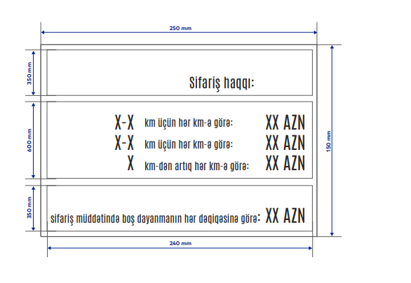 Taksi minik avtomobillərində sərnişin üçün ön oturacağın cihaz panelində yaxşı oxuna biləcək şəkildə sürücünün soyadı, adı, fotoşəkli, eləcə də daşıyıcının (fiziki və ya hüquqi şəxsin) adı, ünvanı, əlaqə nömrəsi, avtonəqliyyat vasitəsinin buraxılış kartının nömrəsi göstərilən 110x60 mm ölçüdə məlumat lövhəsi olmalıdır. Taksi minik avtomobilləri gediş haqqının qiymətini müəyyən etməyə imkan verən taksometr və ya taksometr funksiyalarını yerinə yetirən proqram təminatı olan mobil cihaz ilə təchiz edilməlidir. Taksometr və ya müvafiq proqram təminatını göstərən mobil cihaz taksi minik avtomobilinin salonunda sərnişinlərin rahat məlumat almaları üçün uyğun yerdə quraşdırılmalıdır. Gediş haqqı taksometr və ya taksometr funksiyalarını yerinə yetirən proqram təminatı vasitəsilə müəyyən olunduqda taksometr və ya müvafiq proqram təminatını göstərən mobil cihaz taksi minik avtomobilinin salonunda sərnişinlərin rahat məlumat almaları üçün uyğun yerdə quraşdırılmalıdır. Taksi minik avtomobilinin salonu təmiz, səliqəli saxlanılmalı və xoşagəlməz qoxular olmamalıdır. Taksi minik avtomobillərində sərnişinlər tərəfindən yaxşı görülə bilən yerdə daşınma haqqının tarifləri 4 nömrəli əlavədə göstərilmiş nümunəyə uyğun lövhə şəklində yerləşdirilməlidir. Taksi minik avtomobilində sərnişinlər tərəfindən yaxşı görünən yerdə lövhədə “tütün çəkmək qadağandır” yazısının və ya işarəsinin olması təmin edilməlidir. Hüquqi şəxslərin və ya fərdi sahibkarların sərnişin daşımalarında istifadə etdiyi taksi minik avtomobillərində nağdsız ödəniş üçün POS-terminal olmalıdır.