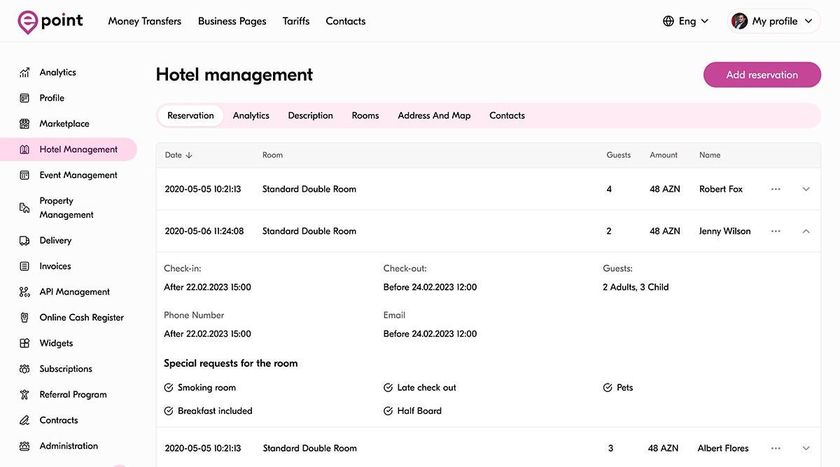 Hotel Management sistemi rezervasiyaların idarə edilməsi üçün adaptiv interfeys təqdim edir ki, bu da personalın uzunmüddətli təliminə ehtiyacı minimuma endirir və otel qonaqları asanlıqla və tez, uyğun otaq və ya çarpayı seçə, rezervasiya haqqını onlayn ödəyə və tətildən həzz ala bilərlər. Əminik ki, bizim inkişafımız ölkənin Turizm sektoruna daha da böyük təkan verəcək və bu sənayedəki bütün müəssisələrin rəqəmsallaşmasına kömək edəcək.