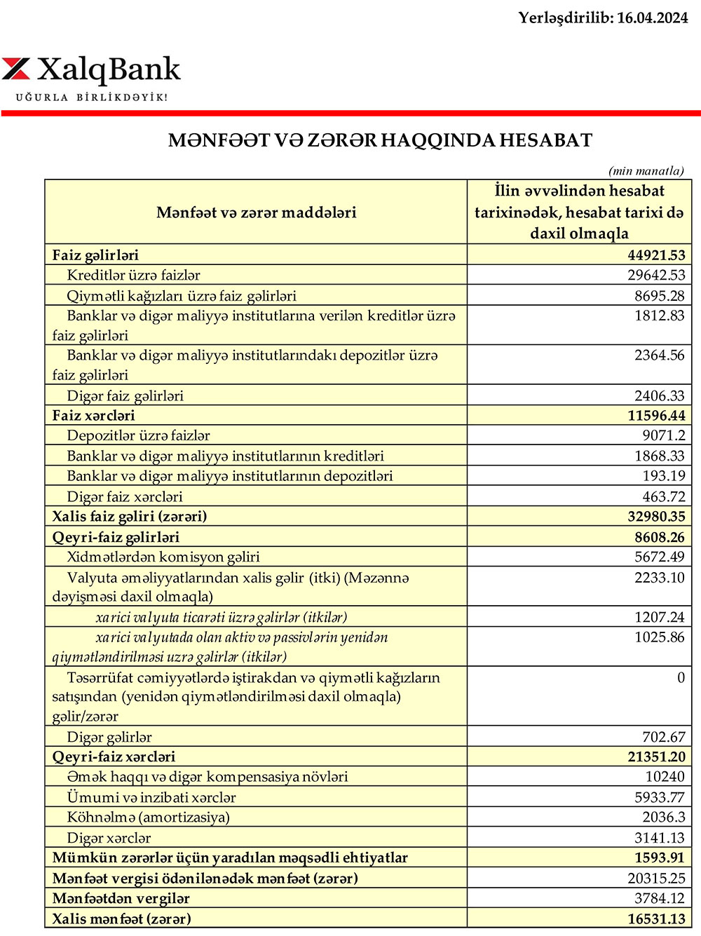 "Xalq Bank" 2024-cü ilin 1-ci rübünü (yanvar-mart) 16 milyon 531 min manat xalis mənfəət ilə başa vurub.