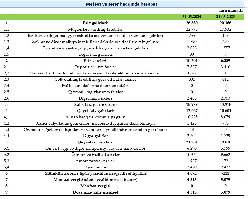 Bankın yaydığı press-relizdə bildirilir ki, yanvar-mart ayları 4 milyon 313 min manat xalis mənfəətlə başa vurulub. Bank aktivlərini ötən ilin müvafiq dövrü ilə müqayisədə 17% artıraraq 1 milyard 80 milyon manata çatdırıb.