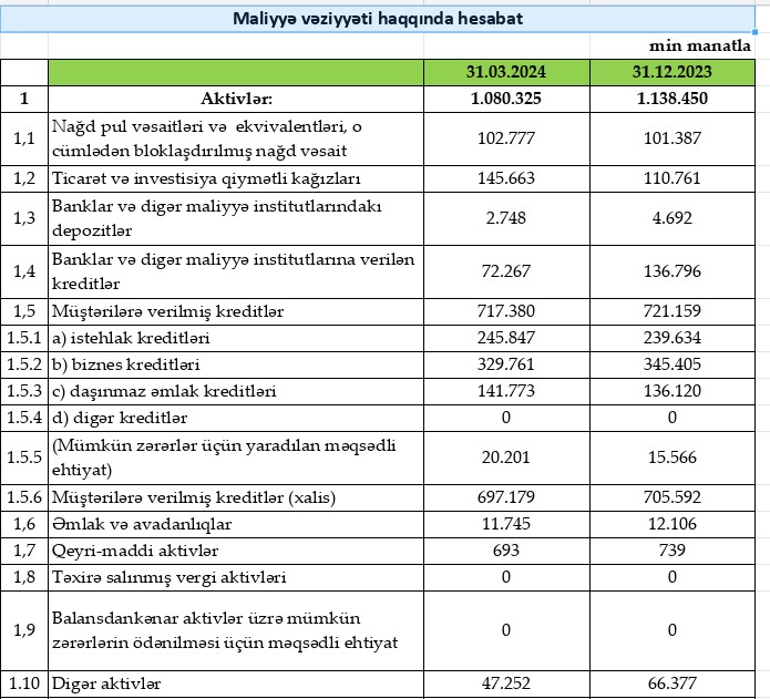 Hesabata əsasən 2023-cü ilin eyni dövrü ilə müqayisədə bankın kredit portfeli 13% artaraq 717 milyon 380 min manat təşkil edib. Belə ki, istehlak kreditləri 14% artaraq 245 milyon 847 min manat, biznes kreditləri portfeli 6% artaraq 329 milyon 761 min manat, daşınmaz əmlak kreditləri portfeli isə 35% artaraq 141 milyon 773 min manat olub.