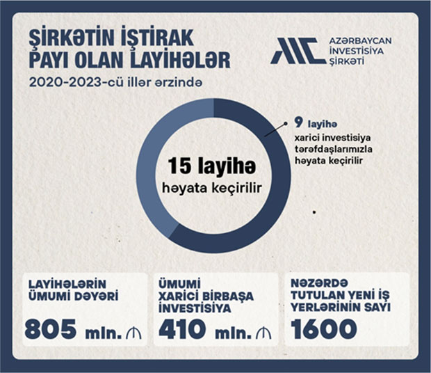 2020-2023-cü illər ərzində AİŞ-ə 200-dən çox investisiya layihəsinə dair müraciət daxil olmuş, təhlillər nəticəsində 15 layihə ilə əlaqədar Müşahidə Şurası investisiya qoyulmasına dair qərar qəbul edib. Şirkətdə hər layihə üzrə yüksəkixtisaslı mütəxəssislər tərəfindən analitik təhlillər aparılır, bazar araşdırması həyata keçirilir. Yuxarıda qeyd olunanlarla birgə, ümumilikdə həyata keçirilmiş 15 layihənin ümumi investisiya dəyəri 805 milyon manat, AİŞ-in iştirak payı isə 70.4 milyon manat təşkil edir. Bu layihələrin böyük əksəriyyətini müxtəlif sənaye sahələrinə aid yeni qurulan layihələr təşkil edir və bu investisiyalar artıq inkişaf və ya tikinti mərhələsindədirlər.