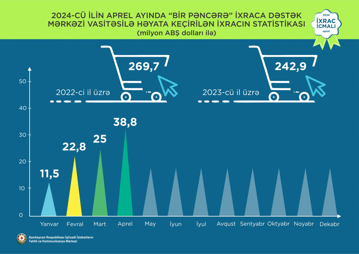 “İxrac icmalı”nda göstərilib ki, 2024-cü ilin aprel ayı ərzində “Bir Pəncərə” İxraca Dəstək Mərkəzi vasitəsilə həyata keçirilmiş qeyri-neft ixracının dəyəri 38,8 milyon ABŞ dolları olub.