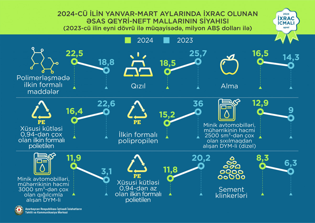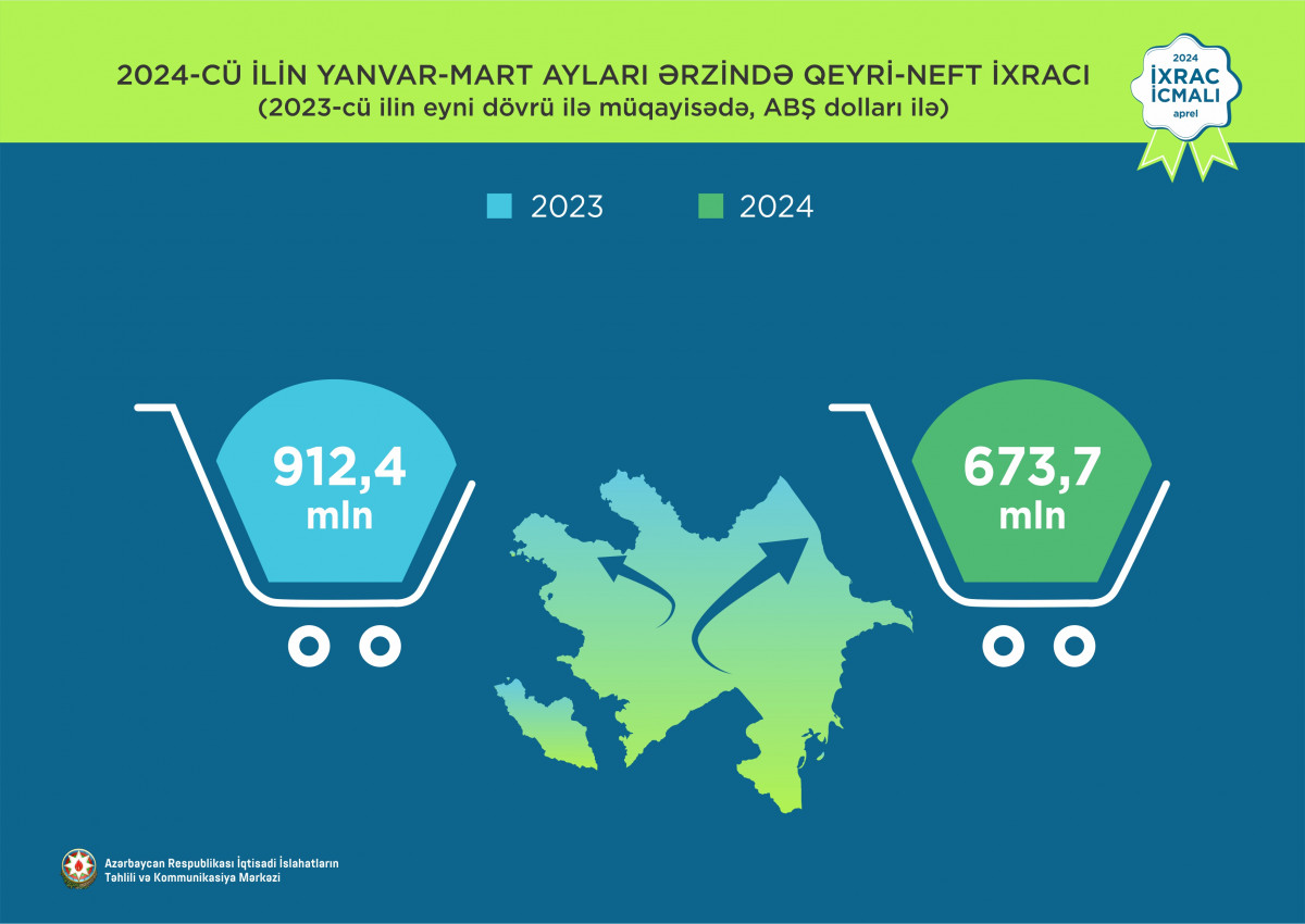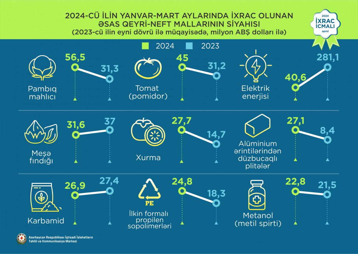 2024-cü ilin yanvar-mart ayları ərzində ixrac edilmiş qeyri-neft sektoruna aid malların siyahısında pambıq mahlıcı (56,5 milyon ABŞ dolları) birinci olub. Bu siyahıda pomidor (tomat) (45 milyon ABŞ dolları) ikinci, elektrik enerjisi (40,6 milyon ABŞ dolları) isə üçüncü yerdə qərarlaşıb.