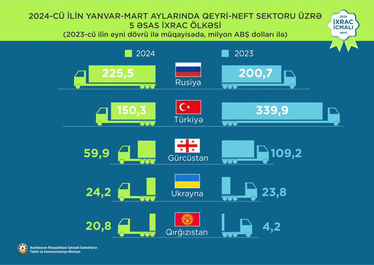 2024-cü ilin yanvar-mart ayları ərzində Rusiya Federasiyasına 225,5 milyon ABŞ dolları, Türkiyəyə 150,3 milyon ABŞ dolları, Gürcüstana 59,9 milyon ABŞ dolları, Ukraynaya 24,2 milyon ABŞ dolları, Qırğızıstana isə 20,8 milyon ABŞ dolları dəyərində qeyri-neft sektoruna aid mal ixrac olunub.