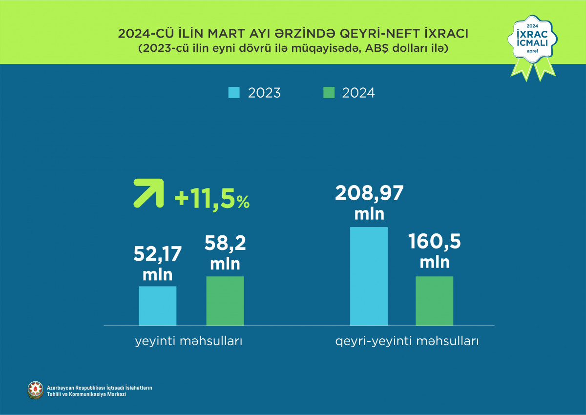 İqtisadi İslahatların Təhlili və Kommunikasiya Mərkəzinin hazırladığı “İxrac icmalı”nın aprel sayına əsasən, 2024-cü ilin I rübü ərzində Azərbaycanın ümumi ixracı 6 milyard ABŞ dolları, qeyri-neft sektoru üzrə ixrac isə 673,7 milyon ABŞ dolları təşkil edib. 2024-cü ilin yanvar-mart ayları ərzində yeyinti məhsulları üzrə ixrac 195,3 milyon ABŞ dollarına bərabər olub.