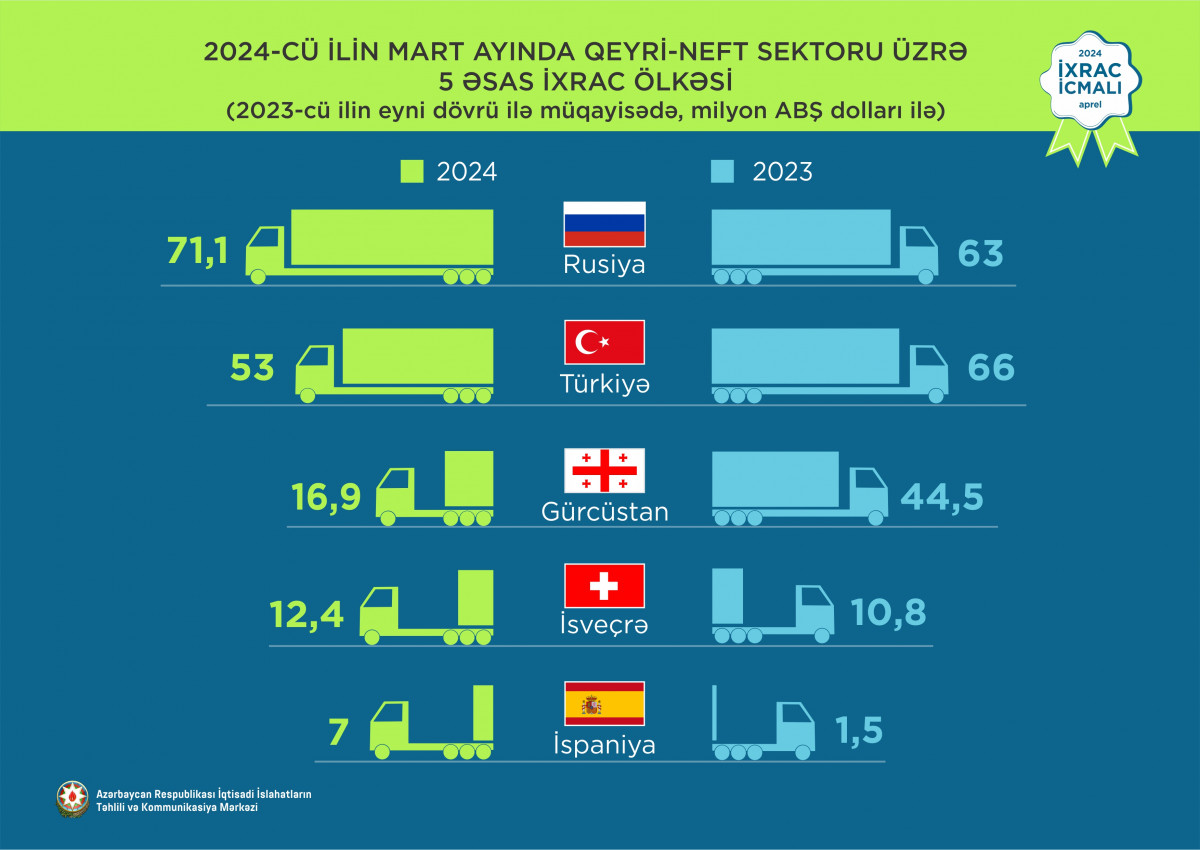 2024-cü ilin mart ayında qeyri-neft sektoruna aid ən çox mal ixrac edilən ölkələrin siyahısında Rusiya Federasiyası (71,1 milyon ABŞ dolları) birinciliyə yüksəlib. Bu siyahıda Türkiyə (53 milyon ABŞ dolları) ikinci və Gürcüstan (16,9 milyon ABŞ dolları) üçüncü olub.