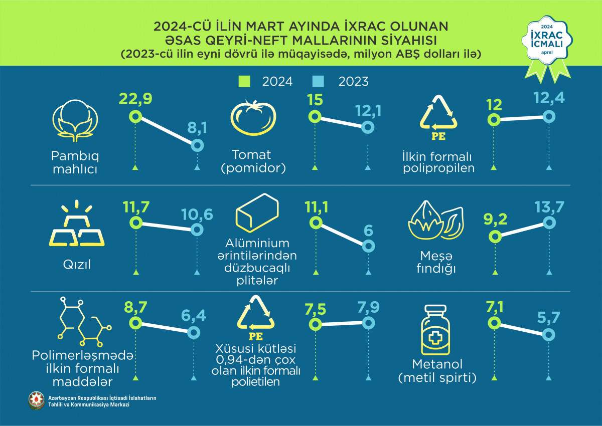 2024-cü ilin mart ayında ixrac edilmiş qeyri-neft sektoruna aid malların siyahısında pambıq mahlıcı (22,9 milyon ABŞ dolları) birinci, pomidor (tomat) (15 milyon ABŞ dolları) ikinci və ilkin formalı polipropilen (12 milyon ABŞ dolları) üçüncü olub.