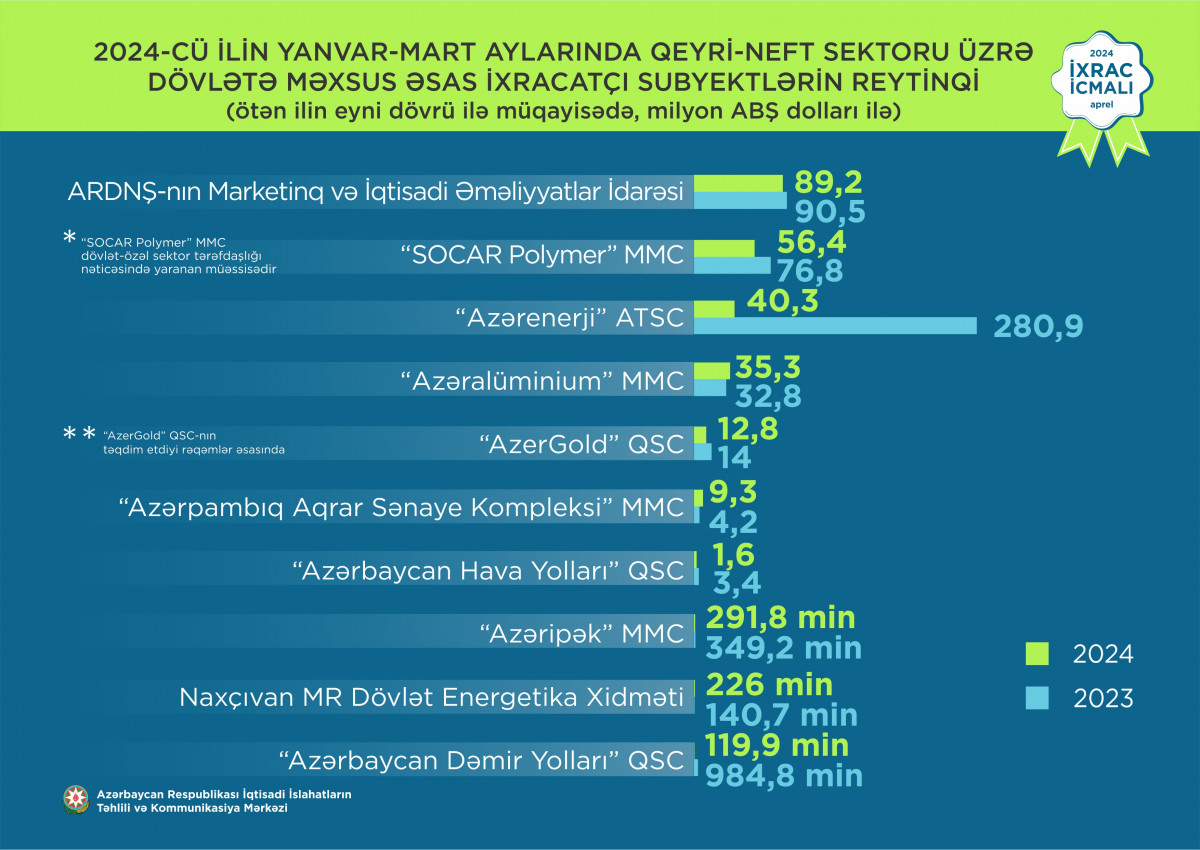 2024-cü ilin yanvar-mart ayları üzrə hazırlanmış qeyri-dövlət ixracatçı subyektlərin reytinqində ilk onluqda aşağıdakı şirkətlər təmsil olunublar: “MKT İstehsalat Kommersiya” MMC, “P-Aqro” MMC, Muradova Sahibə Səlimət qızı, “My Fruit” MMC, “Technopack” MMC, “Mors Trading” MMC, “Baku Steel Company” QSC, “Soil Boons” MMC, “Khan-El” MMC, “Atena” MMC.