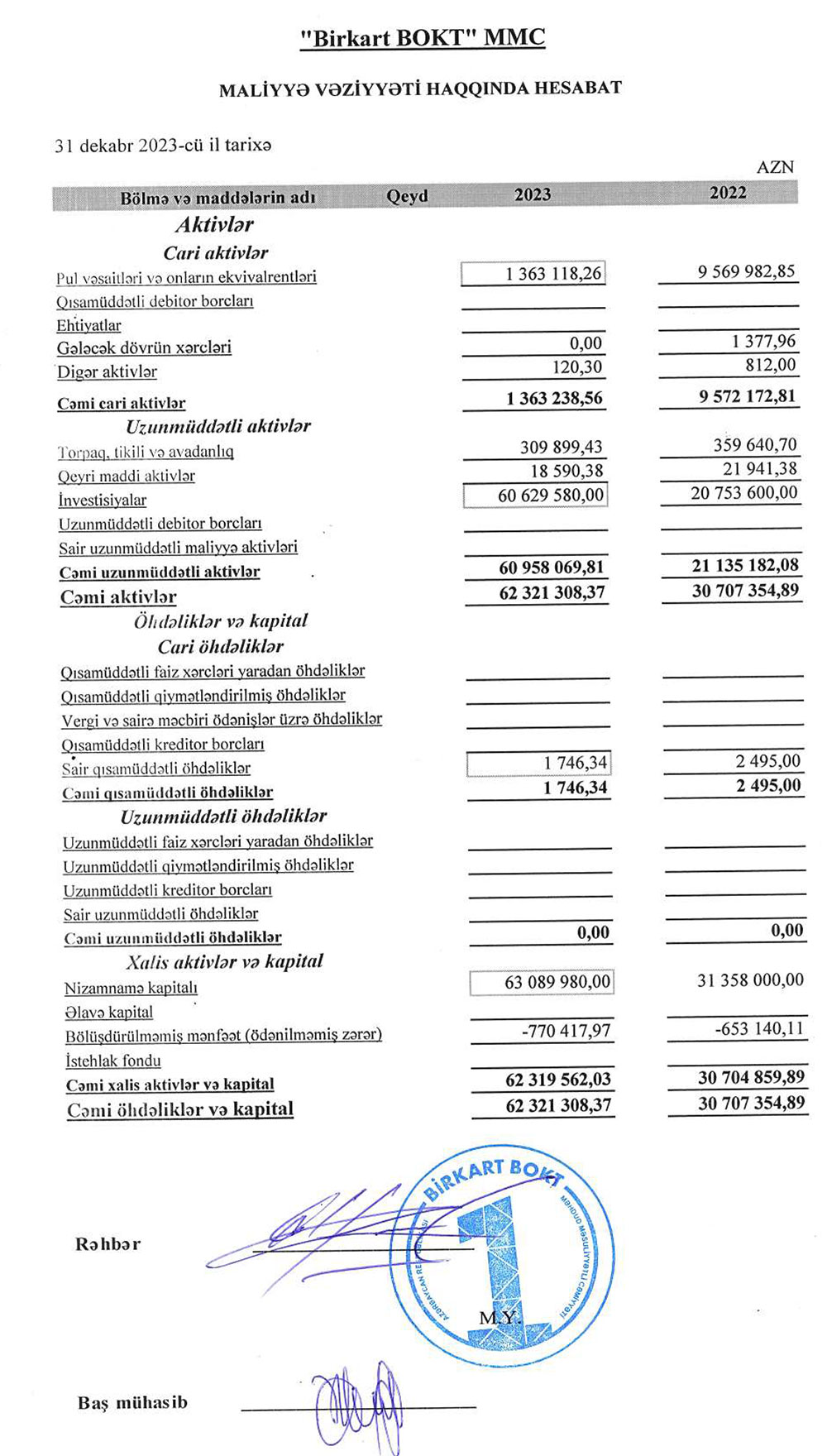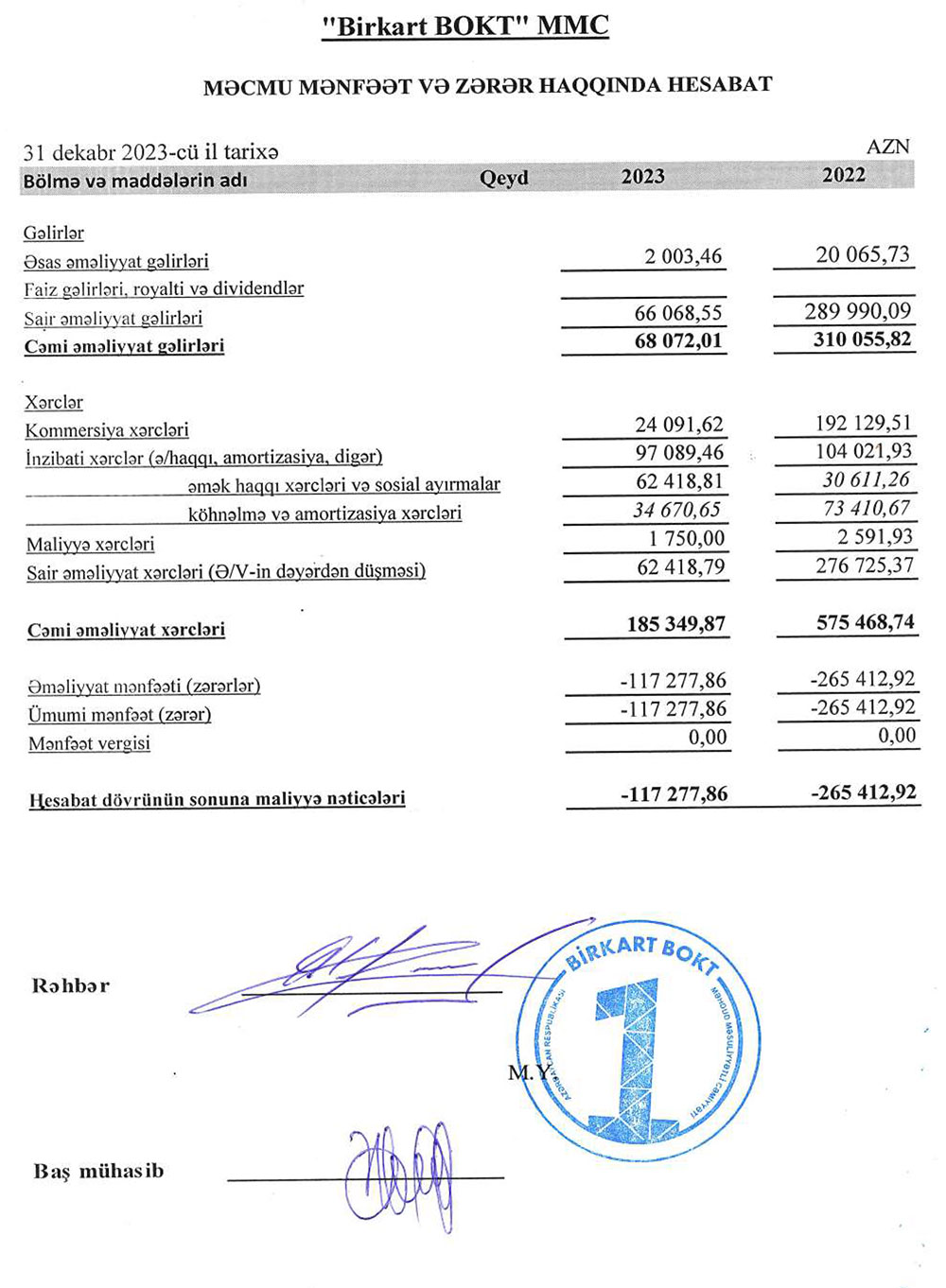 "Birkart" BOKT MMC 2023-cü ili 117 min 278 manat xalis zərər ilə başa vurub. Təşkilat 2022-ci ili 265 min 413 manat xalis zərər ilə bağlamışdı. Beləliklə, ötən il "Birkart" BOKT-ın xalis zərəri 2,3 dəfə azalıb.