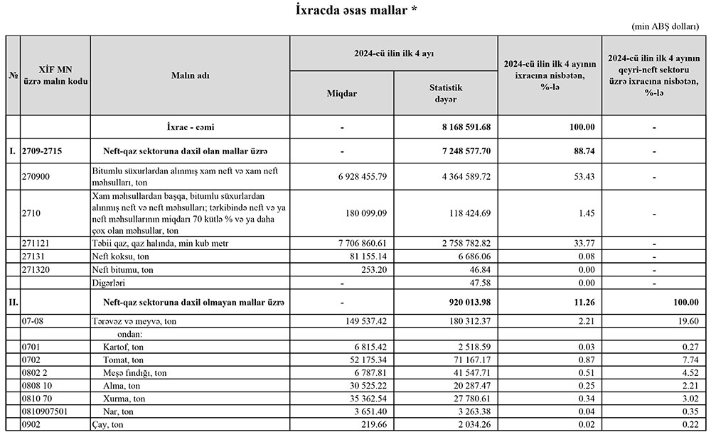 2024-cü ilin yanvar-aprel aylarında (ilk 4ayda) Azərbaycanın ən çox ixrac və idxal etdiyi mallar.