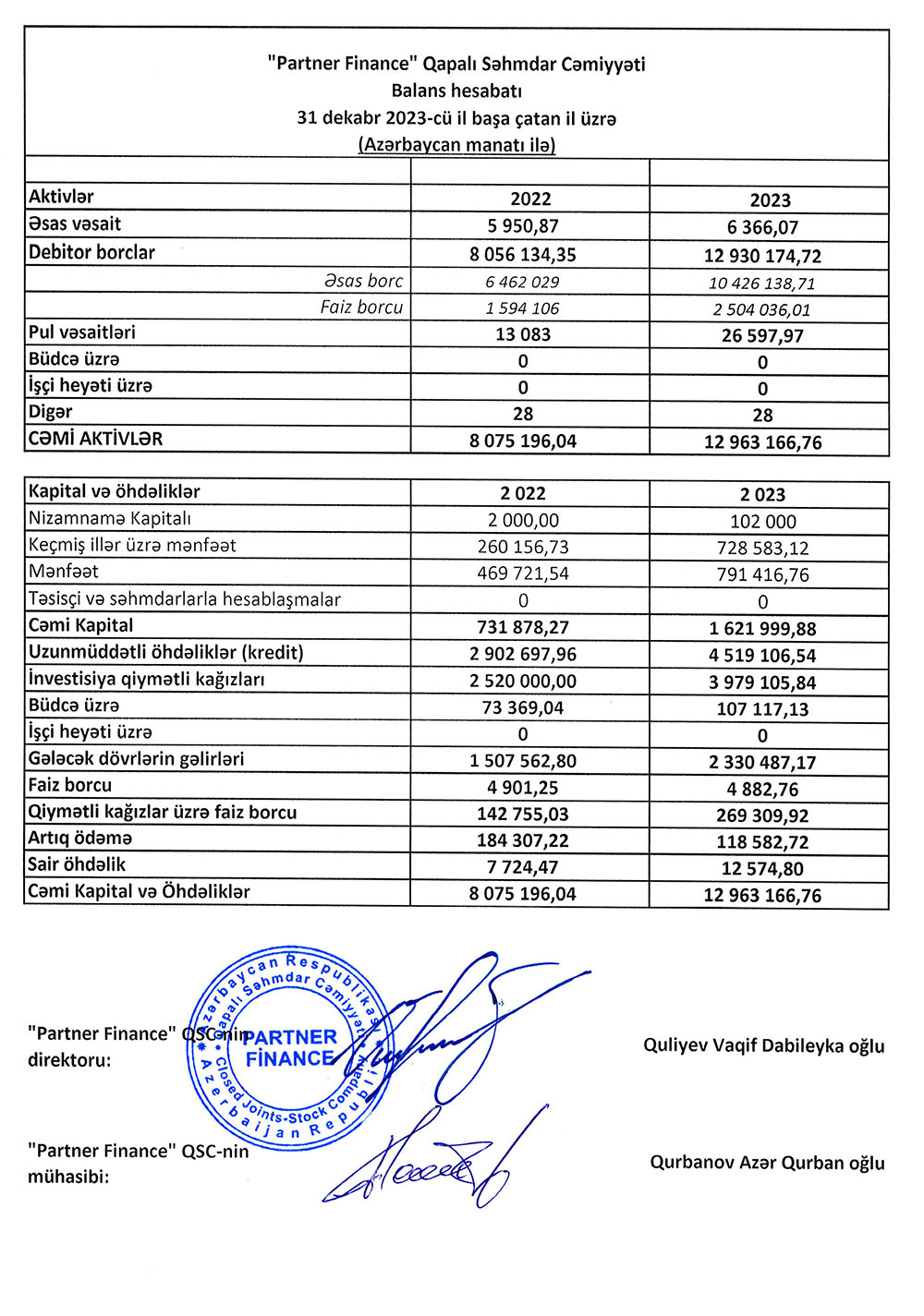 2023-cü ildə "Partner Fiпапсе"ın lizinq portfeli 60,5% və ya 4 milyon 874 min manat artaraq 12 milyon 930 min manata çatıb.