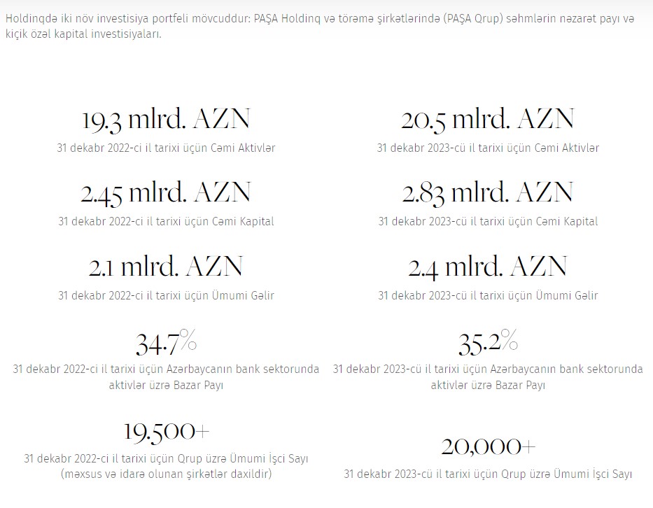31 dekabr 2023-cü il tarixi ndə "PAŞA Holding"in Azərbaycanın bank sektorunda aktivlər üzrə bazar payı 35,2% təşkil edib (2022-ci ilin sonunda 34,7%).