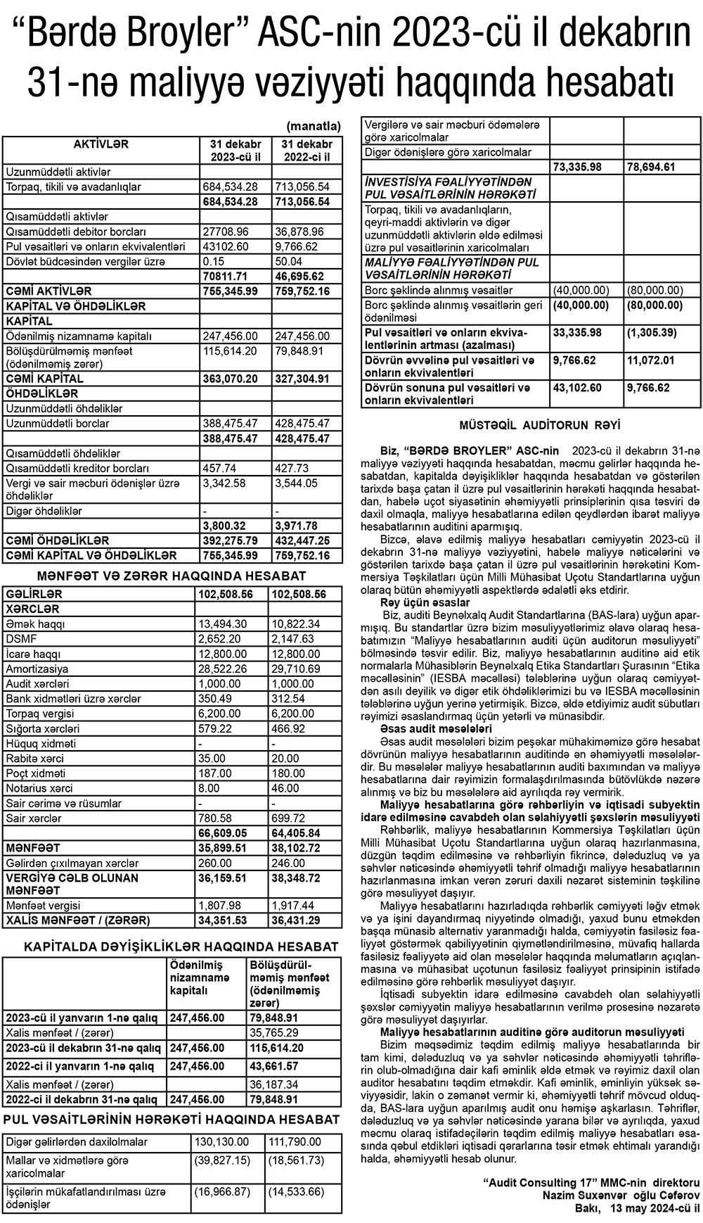 “Bərdə Broyler” ASC 2023-cü ili 34 min 351 manat xalis mənfəət ilə başa vurub. Şirkət 2022-ci ili 36 min 431 manat xalis mənfəət ilə bağlamışdı.