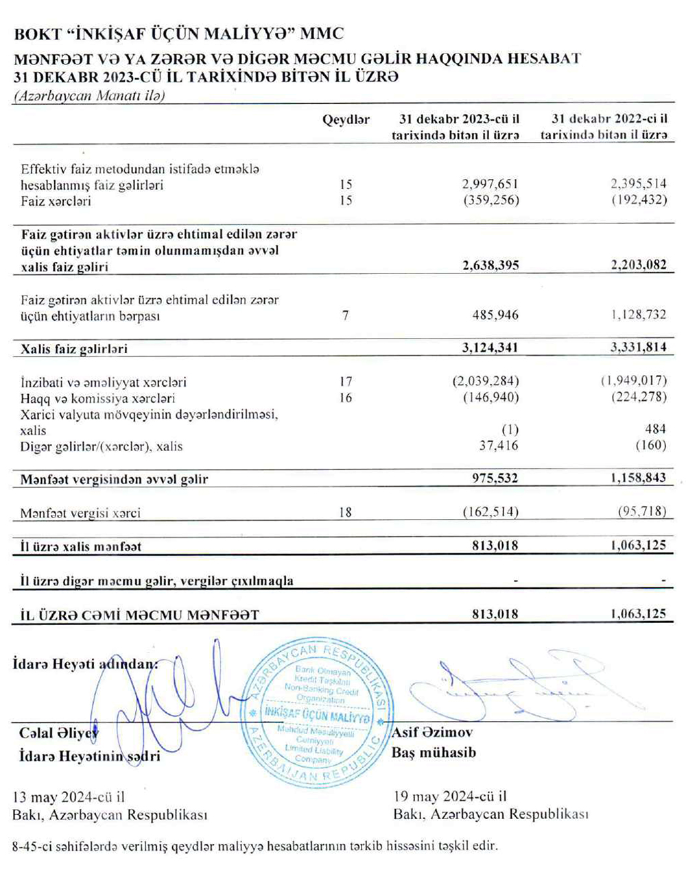 "İnkişaf üçün Maliyyə" Bank Olmayan Kredit Təşkilatı MMC 2023-cü ili 813 min manat xalis mənfəət ilə başa vurub. Kredit təşkilatı 2022-ci ili 1 milyon 63 min manat xalis mənfəət ilə bağlamışdı. Beləliklə, "İnkişaf üçün Maliyyə"nin xalis mənfəəti 250 min manat və ya 23,5% azalıb.