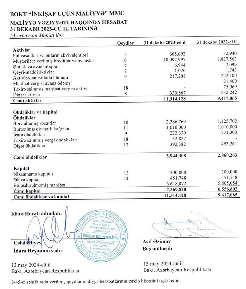 "İnkişaf üçün Maliyyə"nin kredit portfeli (müştərilərə verilmiş kreditlər) 2023-cü ildə 2022-ci illə müqayisədə 1 milyon 265 min manat və ya 14% artaraq 10 milyon 93 min manataçatıb.