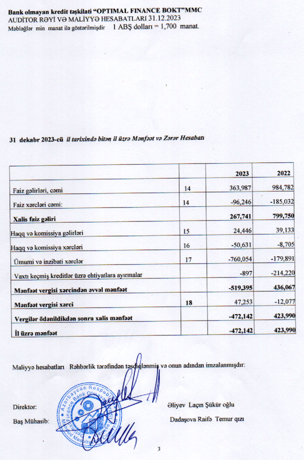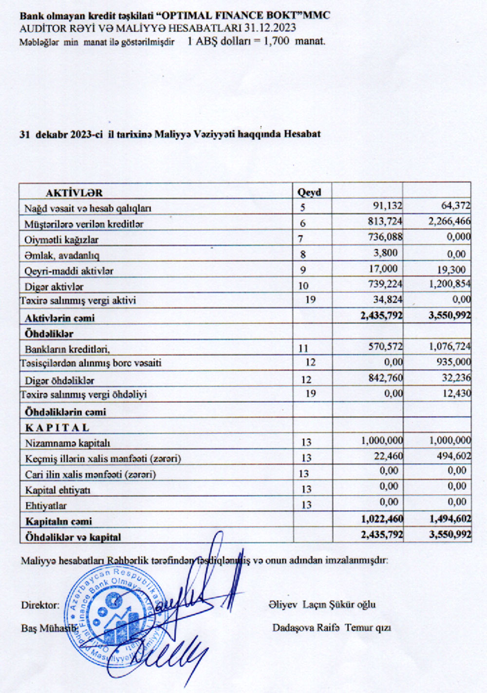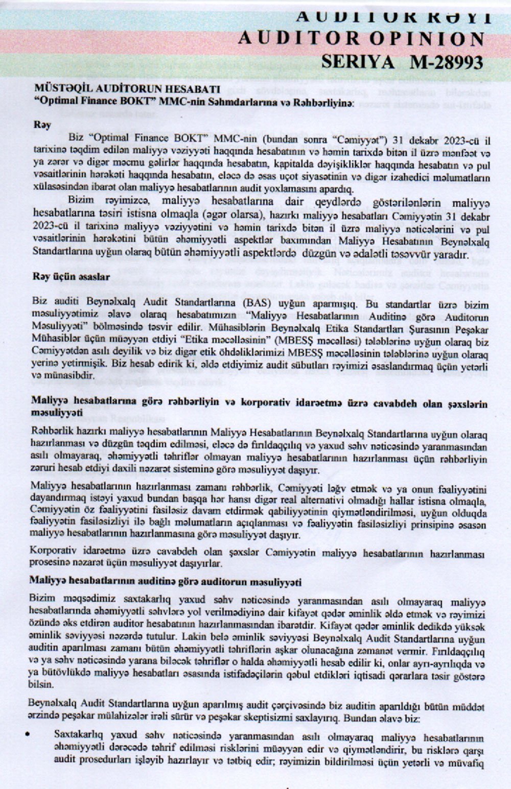 31 dekabr 2023-cü il tarixində bitən il üzrə “Optimal Finance BOKT” MMC-nin maliyyə hesabatları