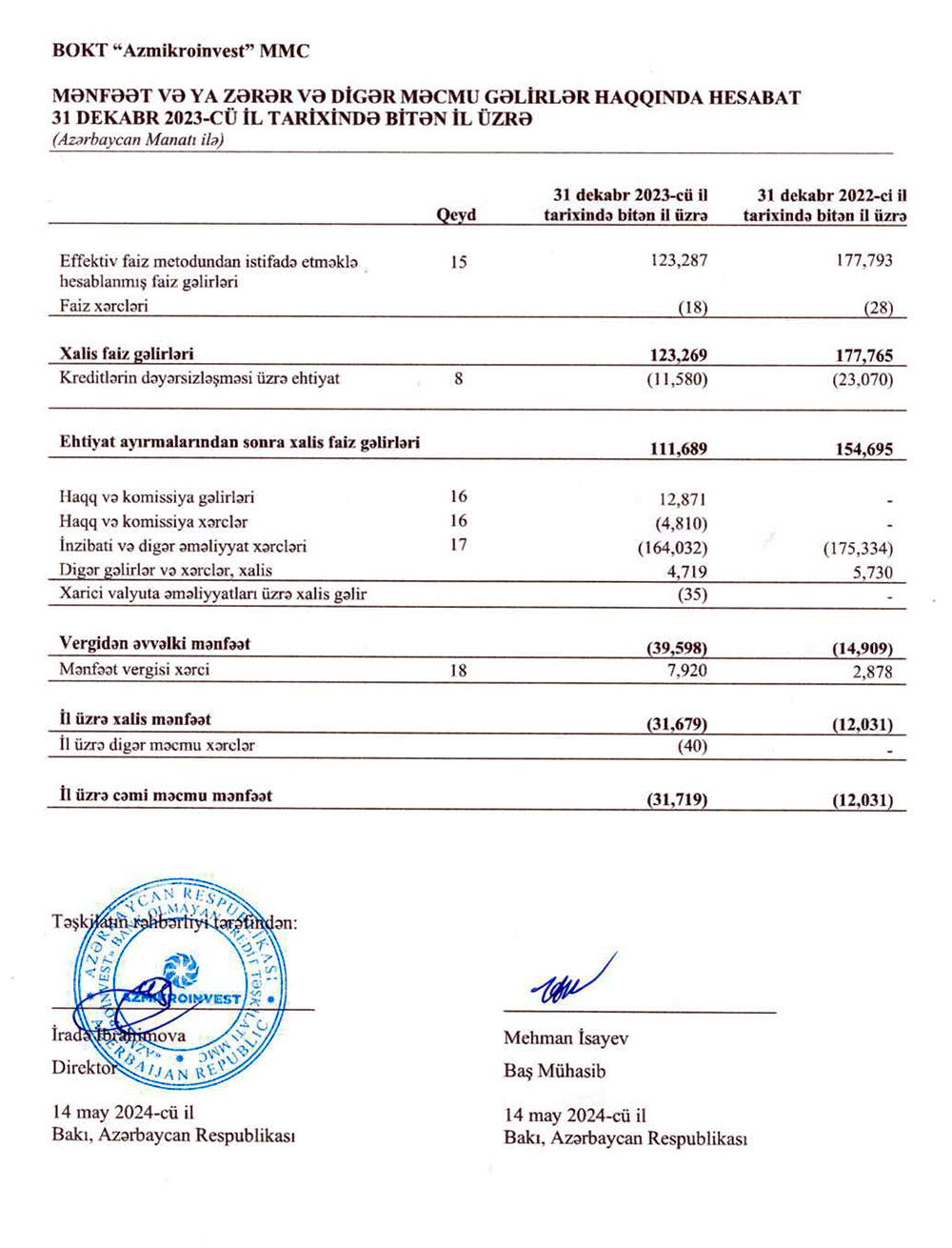Ötən il BOKT "Azmikroinvest"in kredit portfeli (müştərilərə verilmiş kreditlər) 31,9% artaraq 31 dekabr 2023-cü il tarixində 1 milyon 134.min manata çatıb.