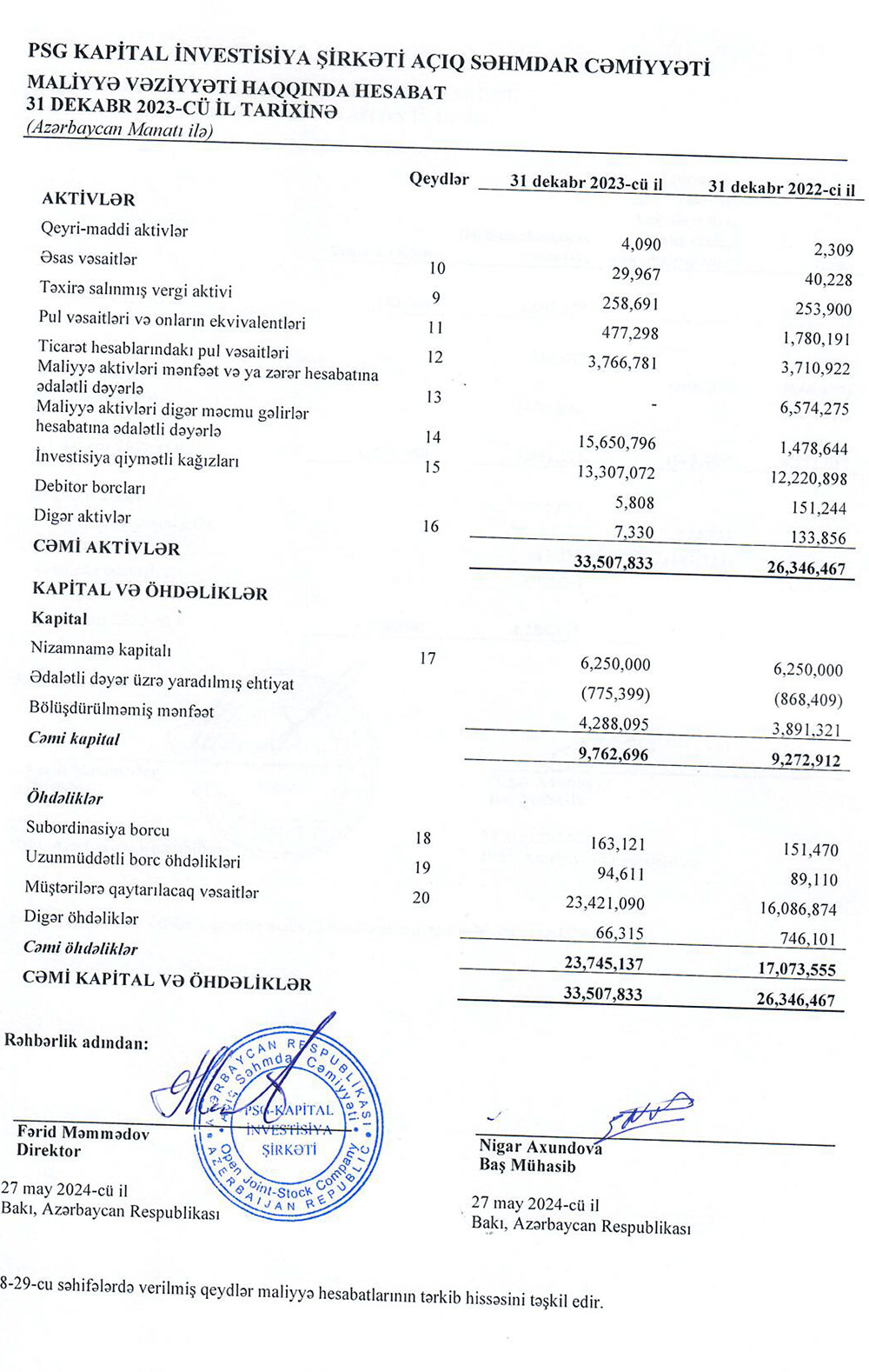 "PSG Kapital İnvestisiya Şirkəti" maliyyə vəziyyətini açıqladı