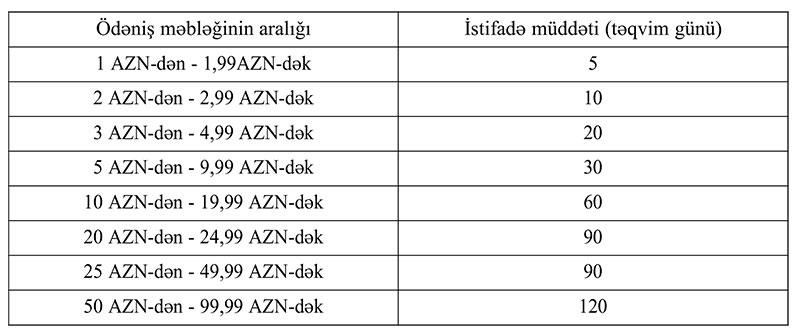 Beləliklə, 1 iyul 2024-cü il tarixindən etibarən 1 manatlıq ödəniş (danışıq) kartının istifadə müddəti 5 gün (hazırda 7 gün), 2 manatlıq ödəniş (danışıq) kartının istifadə müddəti 10 gün (hazırda 14 gün), 3 manatlıq ödəniş (danışıq) kartının istifadə müddəti 20 gün (hazırda 30 gün), 5 manatlıq ödəniş (danışıq) kartının istifadə müddəti 30 gün (hazırda 60 gün), 10 manatlıq ödəniş (danışıq) kartının istifadə müddəti 60 gün (hazırda 90 gün), 25 manatlıq ödəniş (danışıq) kartının istifadə müddəti 90 gün (hazırda 180 gün), 50 manatlıq ödəniş (danışıq) kartının istifadə müddəti 120 gün (hazırda 180 gün), 100 manatlıq ödəniş (danışıq) kartının istifadə müddəti 120 gün (hazırda 180 gün) olacaqdır. Qısası, 1 iyul 2024-cü il tarixindən etibarən istifadə müddətləri azalacaqdır.
