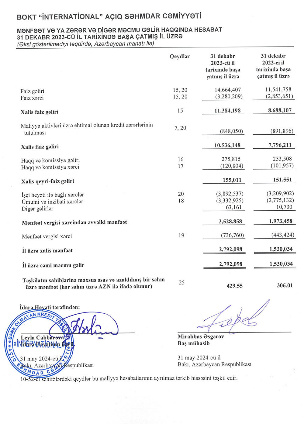 BOKT-un yaydığı press-relizdə bildirilir ki, BOKT “İnternational” ASC-nin ötən ili 2 milyon 792 min 98 manat xalis mənfəət ilə başa vurub ki, bu da 2022-ci illə müqayisədə 1 milyon 262 min 64 manat yuxarı göstəricidir.