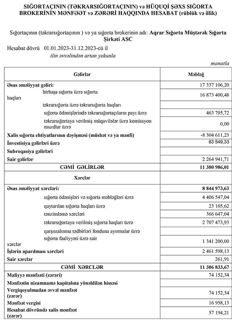 "Aqrar Sığorta Müştərək Sığorta Şirkəti" ASC 2023-cü ili 57 min 194 manat xalis mənfəət ilə başa vurub. Şirkət 2022-ci ili 170 min 150 manat xalis mənfəət ilə bağlamışdı. Beləliklə, ötən il "Aqrar Sığorta Müştərək Sığorta Şirkəti"nin xalis mənfəəti 3 dəfəyə yaxın azalıb.