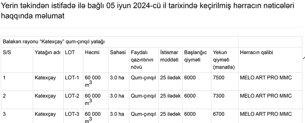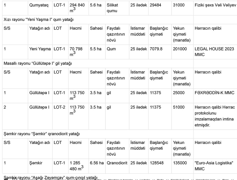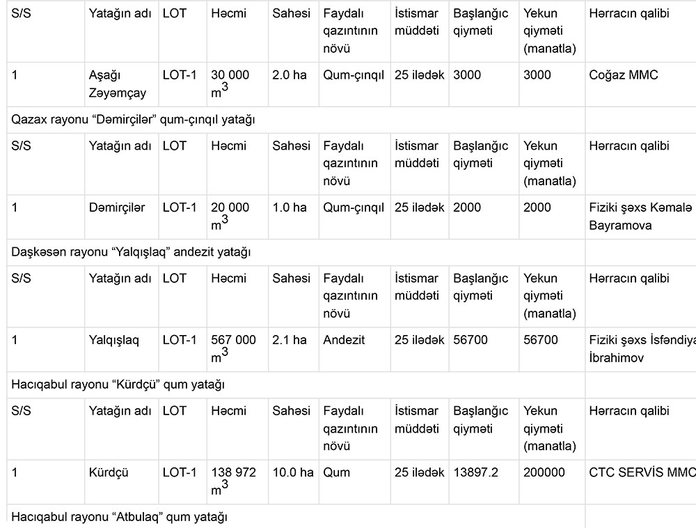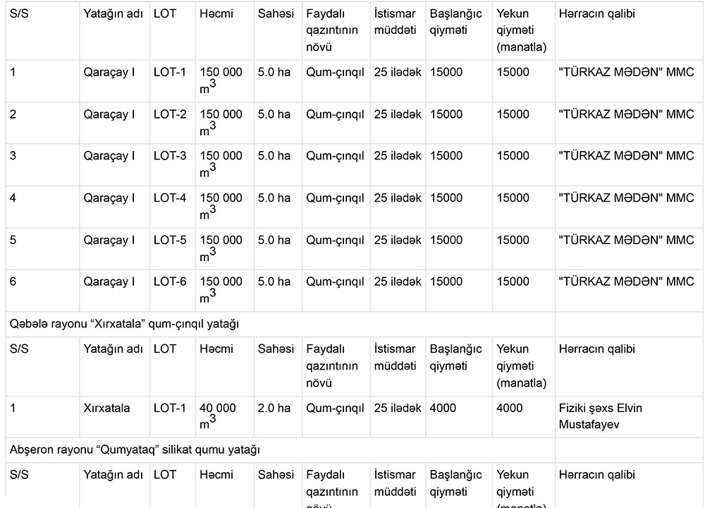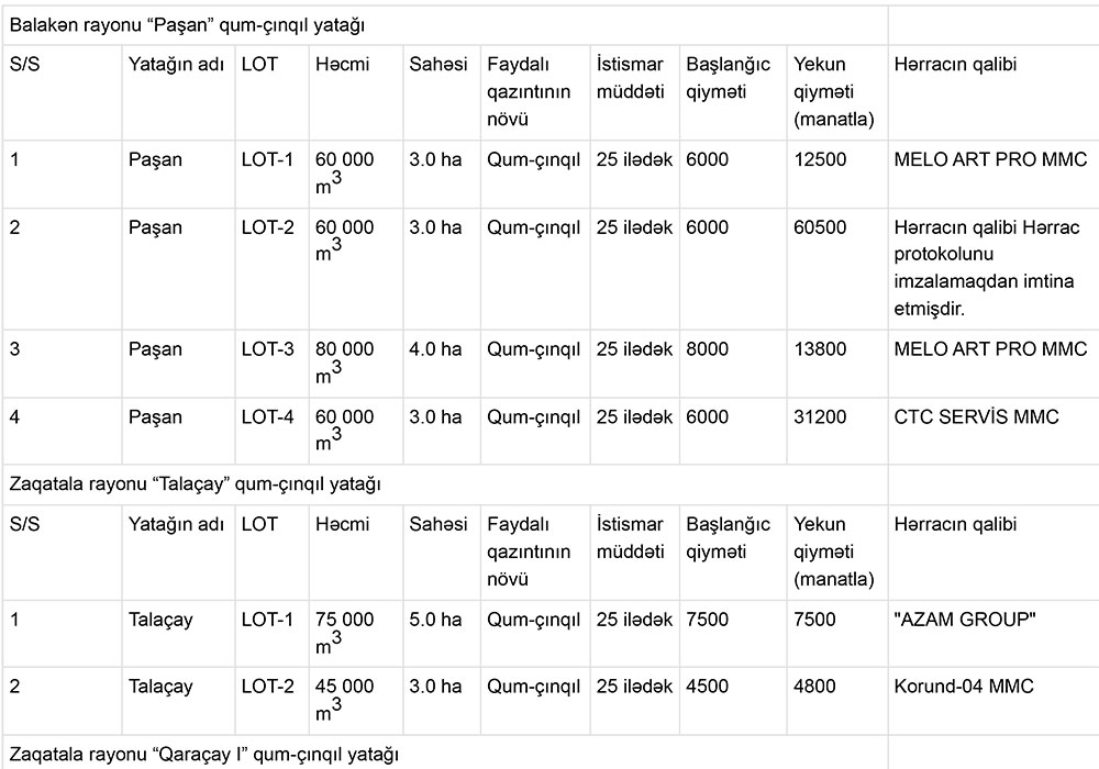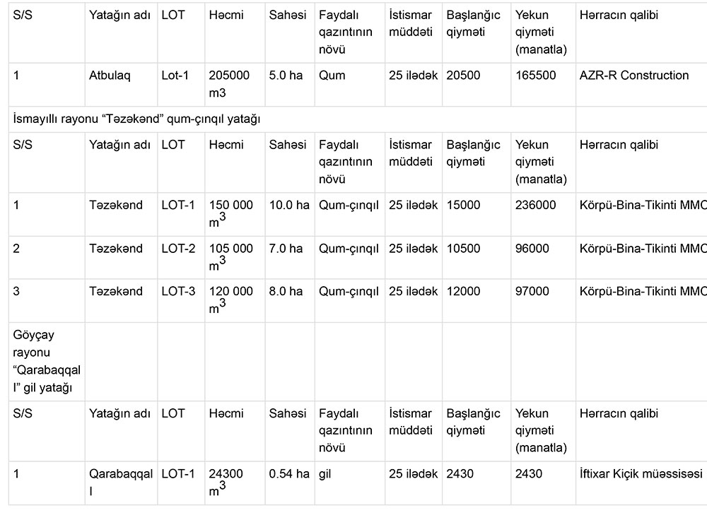 Qeyd edək ki, hərracda qum, qum-çınqıl yataqları ilə yanaşı, gil, qranodiorit, andezit yataqları da investorlara istifadəyə verilib.