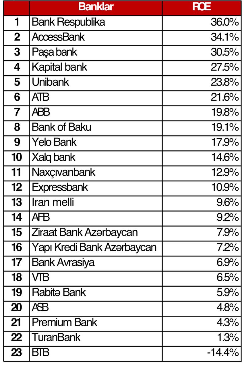 Kapitalın gəlirliliyi (ROE) üzrə isə ilk 5-likdə Bank Respublika, AccessBank, PAŞA Bank, Kapital Bank və Unibank qərarlaşıb.