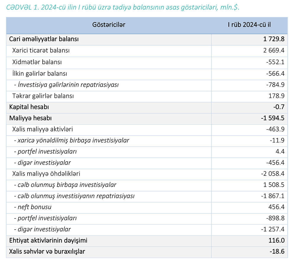 Mərkəzi Bankın açıqladığı 2024-cü ilin I rübü üzrə Azərbaycan Respublikasının tədiyə balansında bildirilir ki, cari əməliyyatlar balansında 1.7 mlrd.$ həcmində profisit formalaşmış, kapitalın və maliyyənin hərəkəti balansında (əsasən maliyyə öhdəliklərinin azalması ilə əlaqədar) isə 1.6 mlrd.$-lıq kəsir yaranmışdır.Profisitli tədiyə balansı şəraitində ölkənin strateji valyuta aktivləri 116 mln.$ artmışdır. Bu dövrdə xam neftin orta qiyməti 88$/barel olmuşdur.