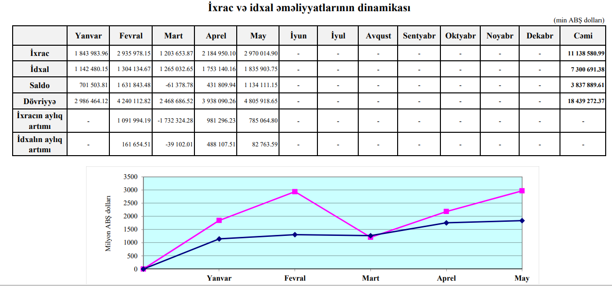 2024-cü ilin yanvar-may dövründə (ilk 5 ayda) Azərbaycanın xarici ticarәt әmәliyyatlarının hәcmi 18 milyard 439 milyon 272 min ABŞ dolları təşkil edib (2023-cü ilin eyni dövründə 22 milyard 953 milyon 74 min ABŞ dolları).