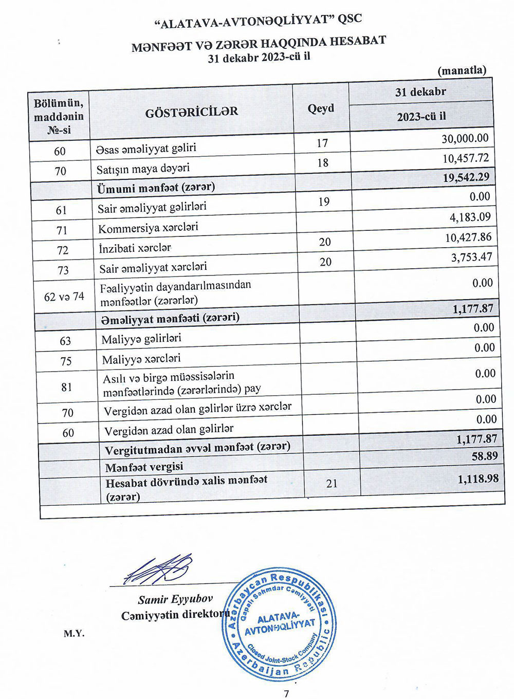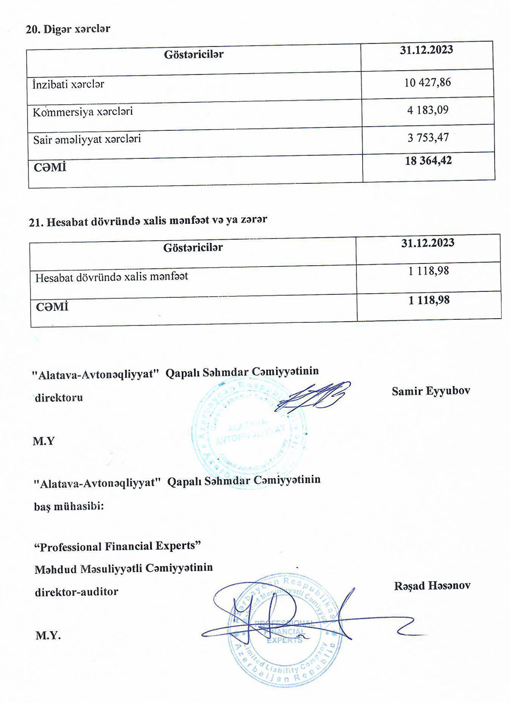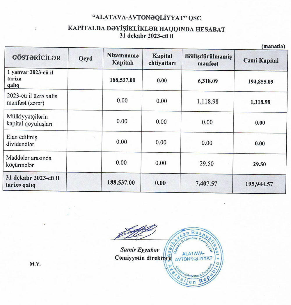 "Alatava-Avtonəqliyyat" QSC-nin 31 dekabr 2023-cü il tarixində başa çatan il üzrə maliyyə hesabatları.