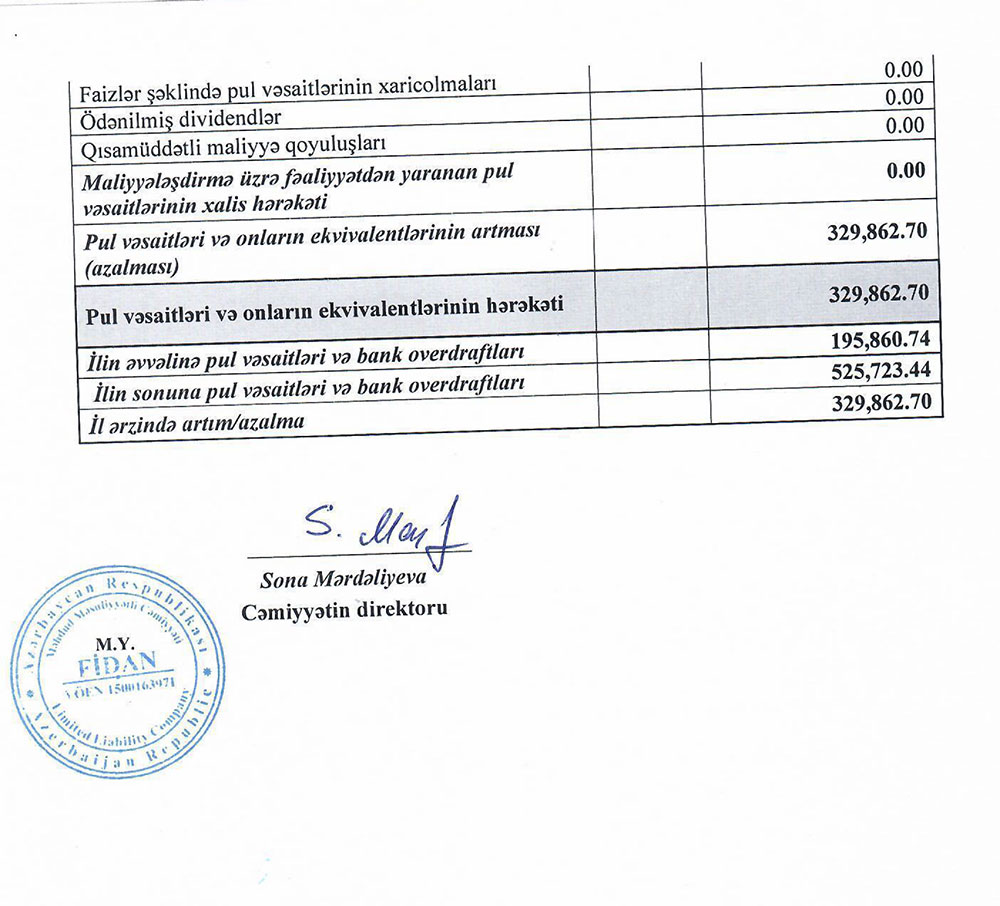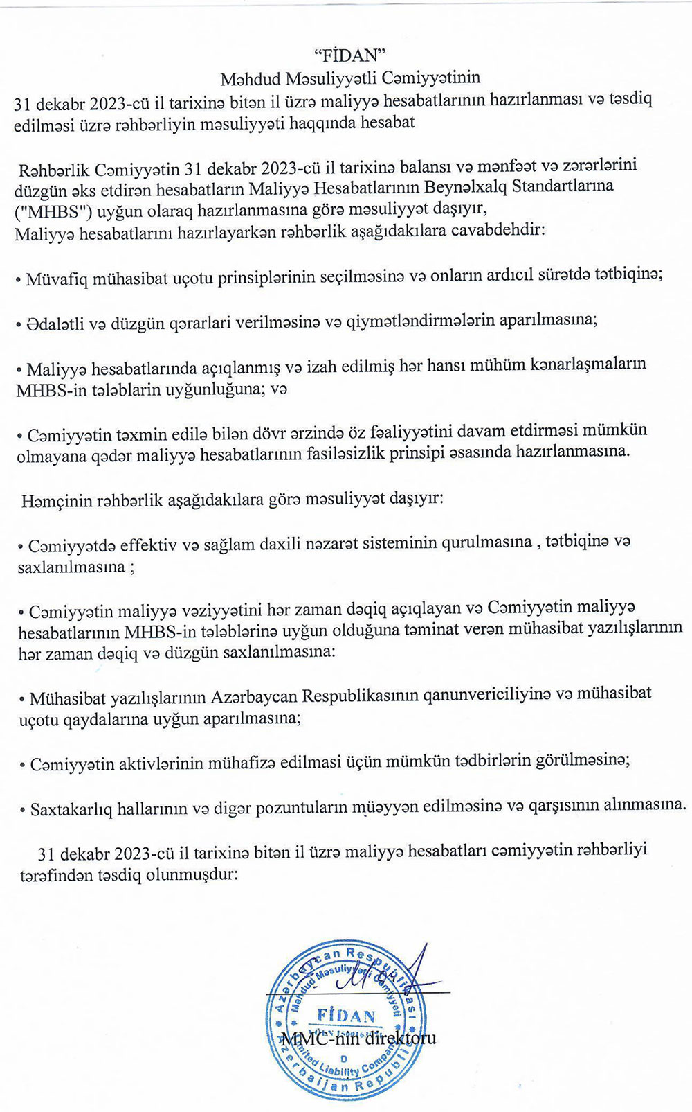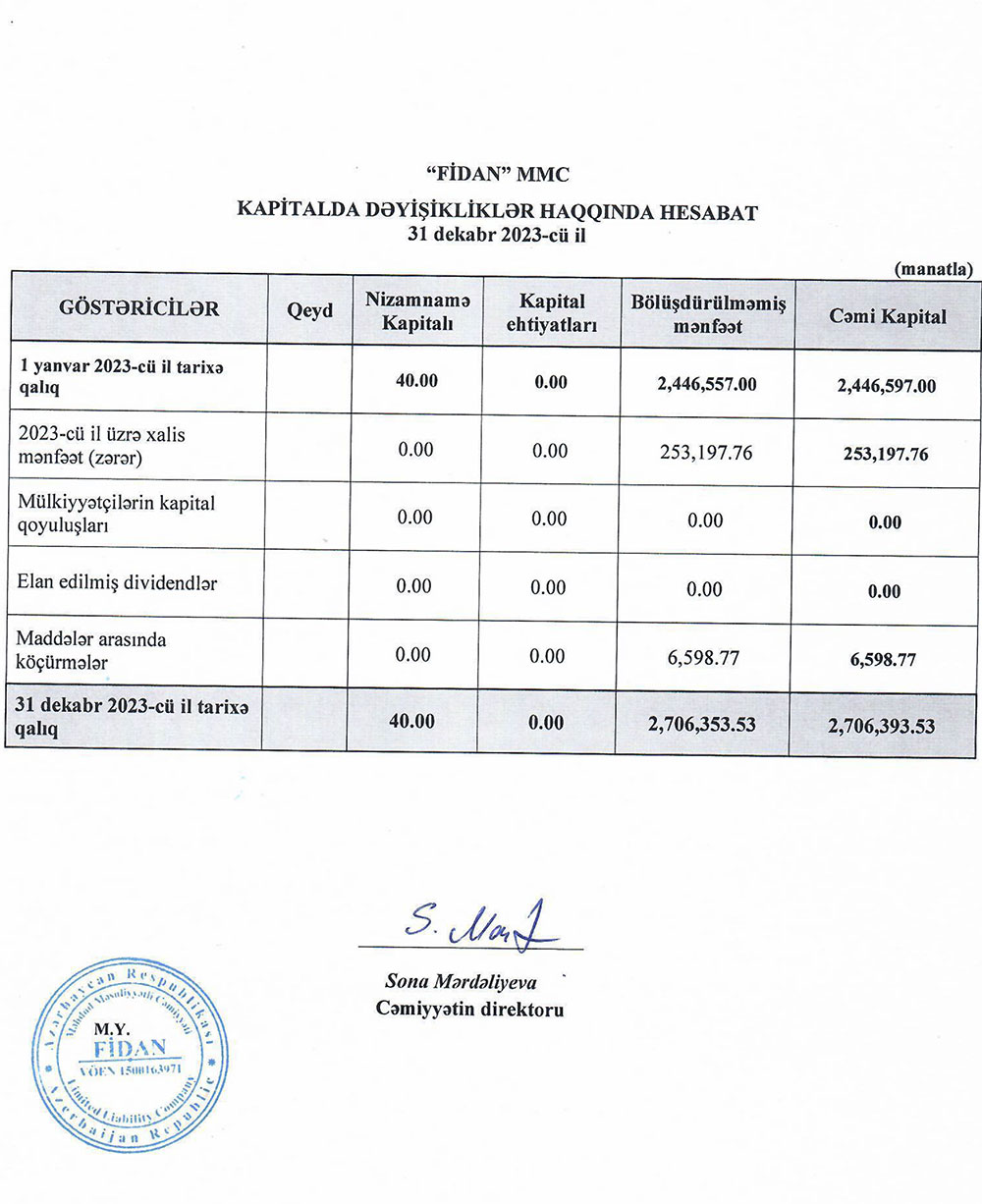 "Fidan" MMC-nin 31 dekabr 2023-cü il tarixində başa çatan il üzrə maliyyə hesabatları