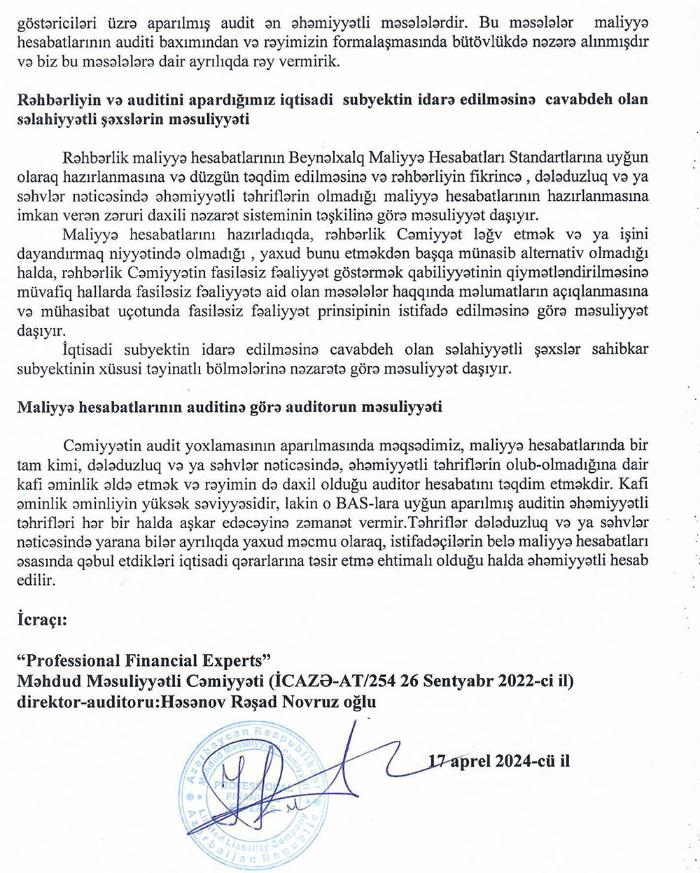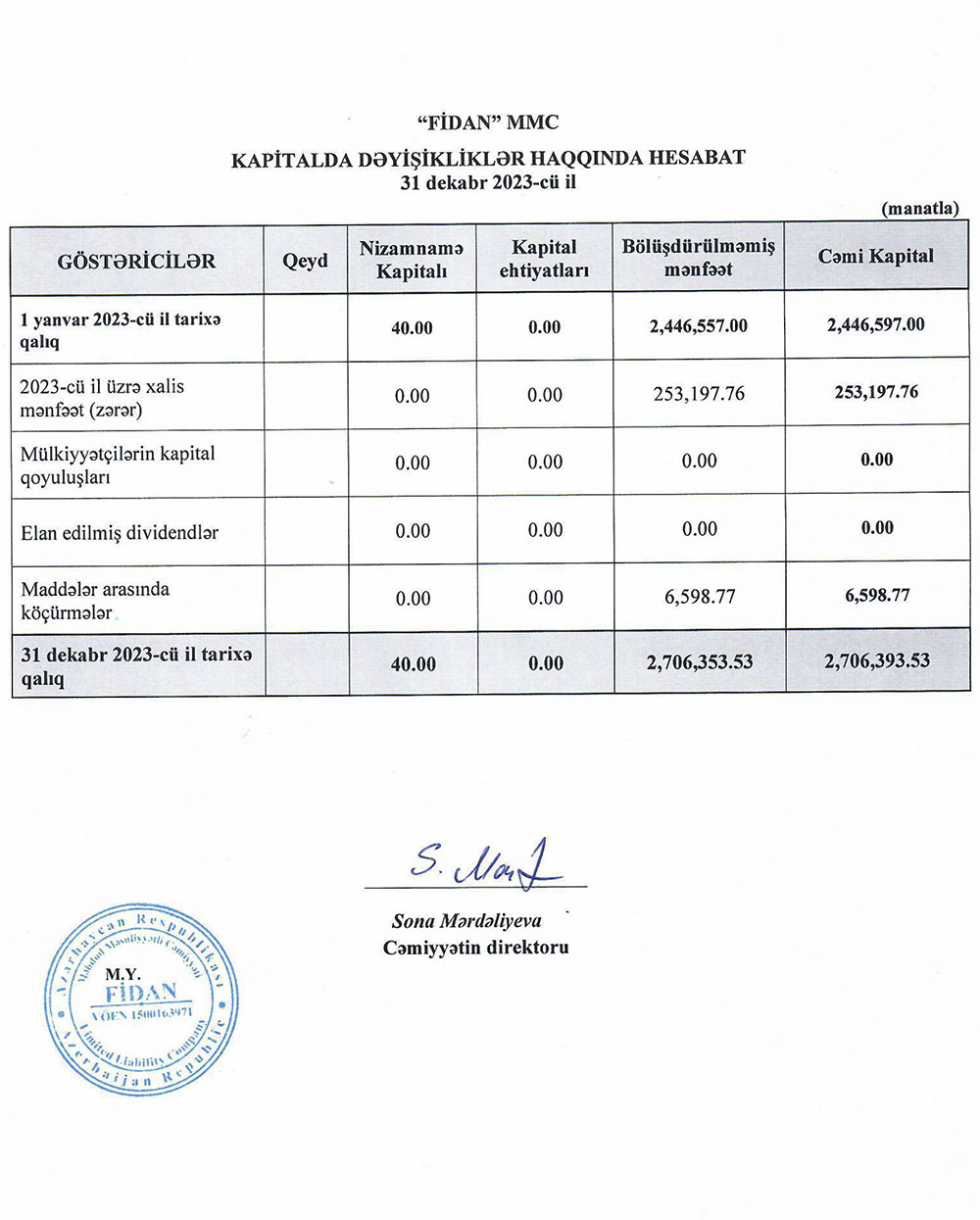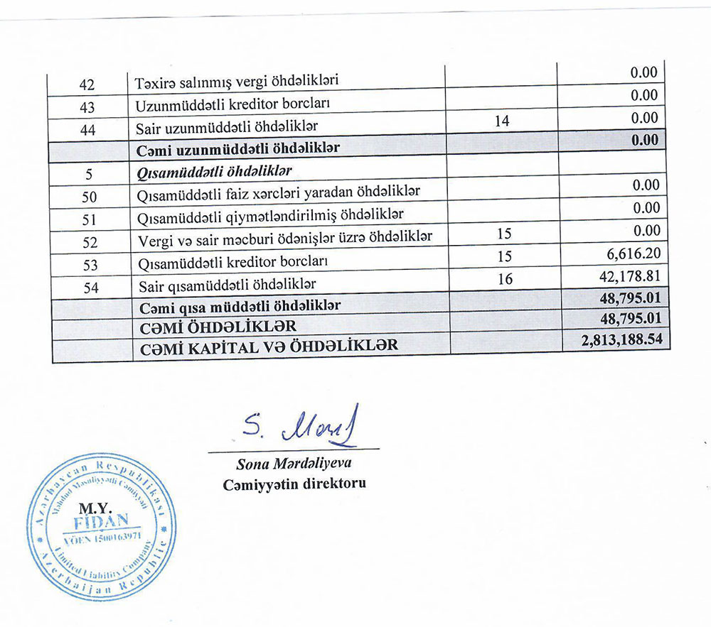 "Fidan" MMC-nin 31 dekabr 2023-cü il tarixində başa çatan il üzrə maliyyə hesabatları