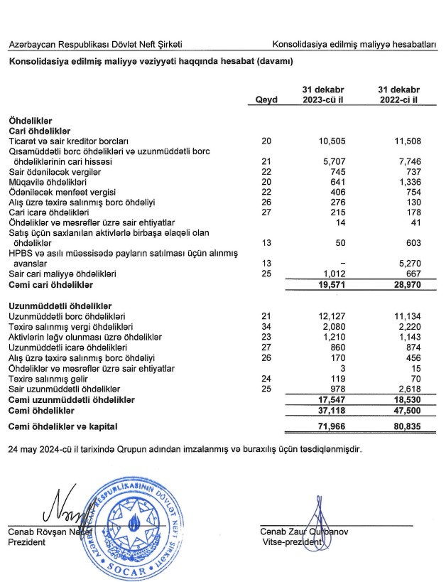 Hesabat dövründə SOCAR-ın cari öhdəlikləri 32,4% azalaraq 19,6 milyard manat, uzunmüddətli öhdəlikləri 5,3% azalaraq 17,6 milyard manat, ümumi öhdəlikləri isə 21,9% azalaraq 37,1 milyard manat təşkil edib.